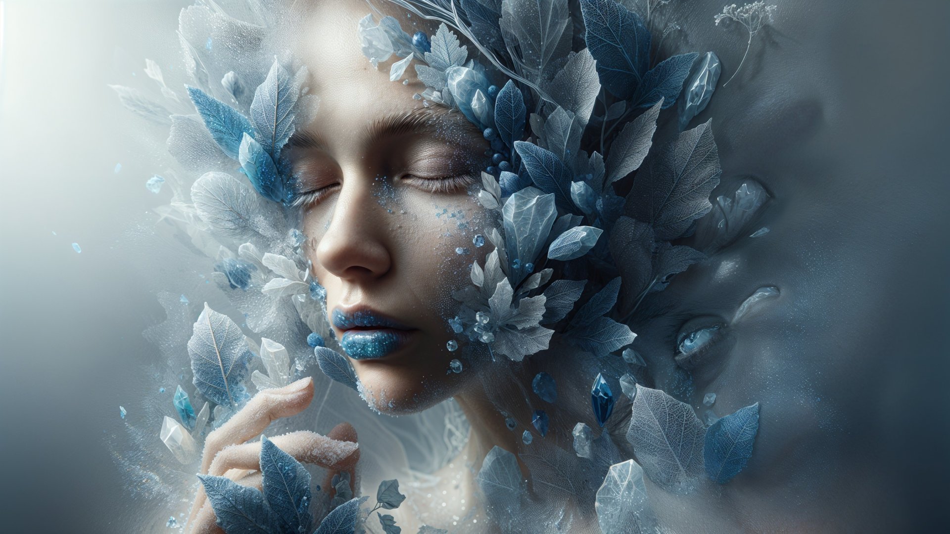 Prompt: ethereal surreal portrait of a woman’s face dissolving into translucent blue leaves and crystalline frost, delicate veins of nature blending with soft porcelain skin, closed eyes, reflective sapphire lips, gentle light and mist, flowing textures and organic motion, dreamlike and poetic atmosphere, emotional serenity, detailed yet fluid composition, fine art photography aesthetic, cinematic glow, icy elegance, masterpiece, trending on artstation, 8K ultra realistic,
