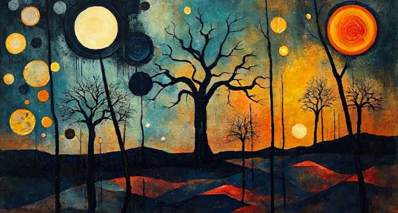 Prompt: Mass surrealism, Halloween,In ochre and gold tones on an old board with burnt edges, roses made of autumn leaves, in the style of Narayan Shridhar Bendre