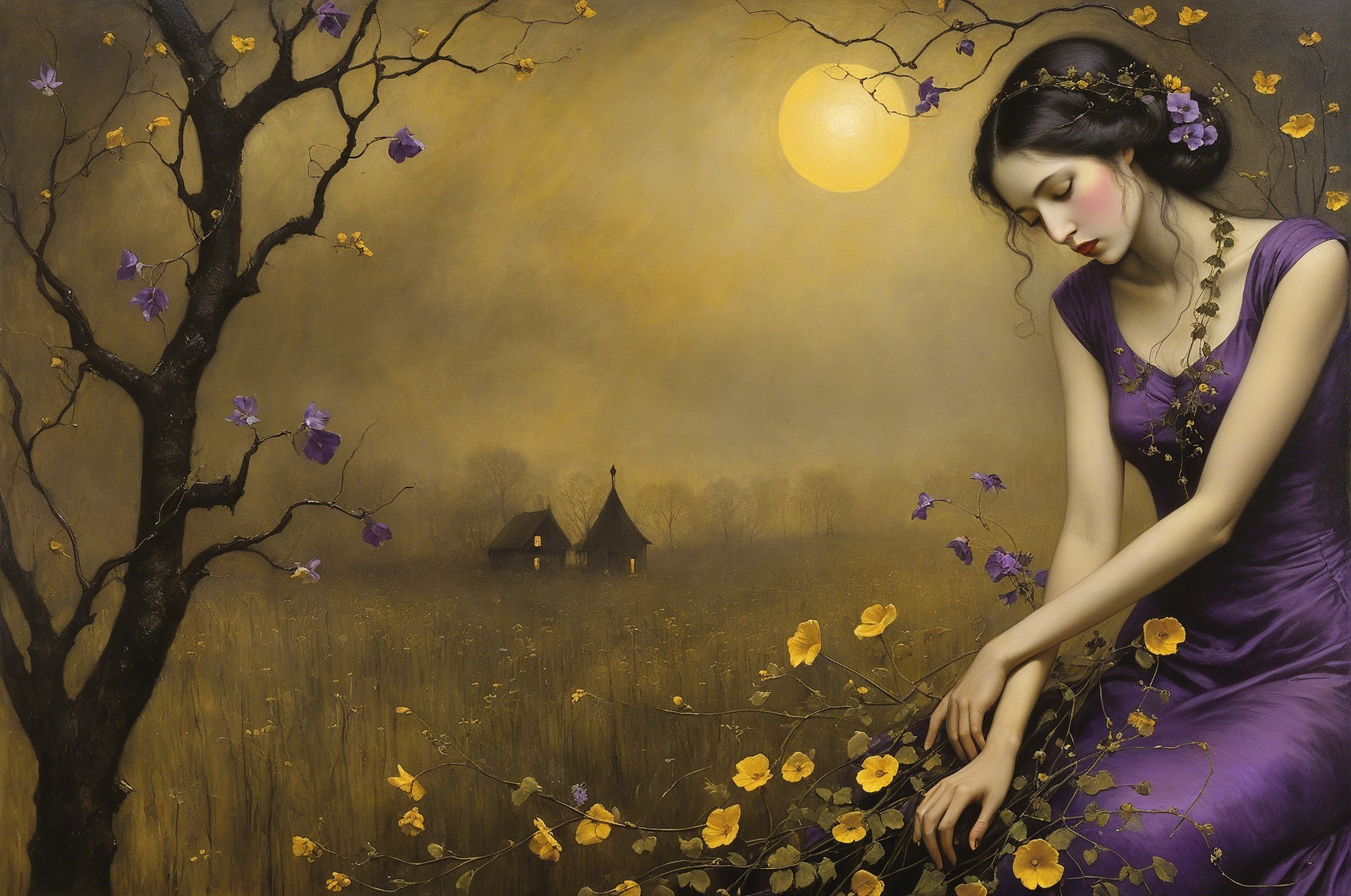 Prompt: Surreal painting of a young woman kneeling beside a crystal-clear stream surrounded by blooming lupines and foxgloves, ethereal twilight sky glowing with auroras, dreamlike figurative composition, elegant hands and serene expression, masterpiece, gouache and pastel on handmade paper, weathered and textured surface, whimsical and poetic, soft magical realism, delicate brushwork and tiny intricate details, glowing and reflective water, storybook illustration style, enchanted forest clearing, cinematic depth of field, luminous atmosphere, hyper-detailed, by Loish, Alphonse Mucha, and Karla Ortiz, inspired by pre-Raphaelite painters, trending on ArtStation, painterly, soft vignette, sharp focus, rich vibrant colors, enchanting and mystical, fantasy realism, ultra high quality, art with soul, highly rendered, breathtaking and elaborate, intricate ornamental borders, beautiful and mesmerizing.