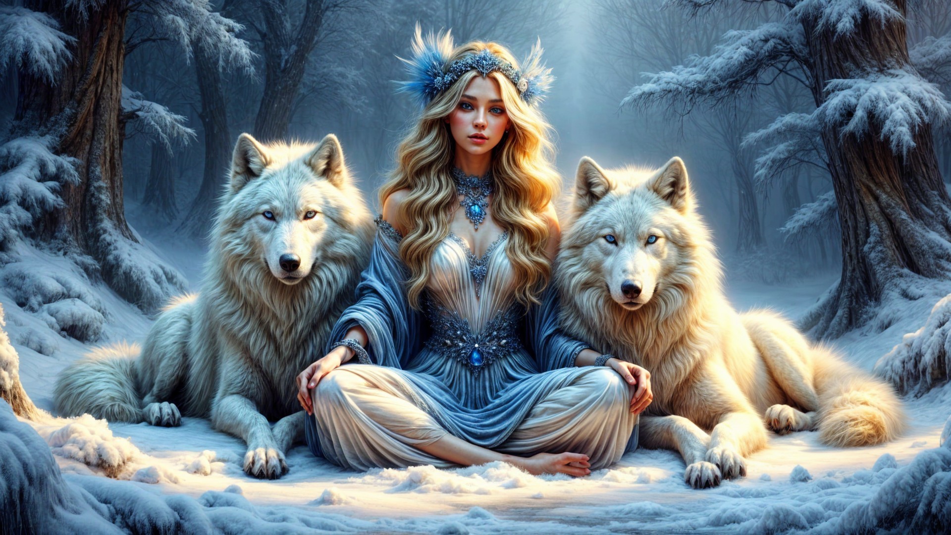 Prompt: A beautiful woman seated cross-legged between two majestic white wolves in a snow-draped forest. Her long blonde hair flows like spun gold around her shoulders, framing striking blue eyes that mirror the wolves' own luminous azure gaze. She wears an intricate white feathered headpiece studded with icy gemstones, complemented by an elaborate sapphire necklace and matching earrings that catch a soft ethereal glow. Her white fur-trimmed outfit displays meticulous texture, echoing the wolves' thick, detailed coats. Snow clings to dark pine branches and blankets the ground, while subtle rim lighting accentuates the trio against the muted backdrop. Centered composition and rule of thirds emphasize her serene expression amidst the mystical atmosphere, rendered in vibrant dreamlike colors with hyperrealistic detail—from jewelry facets to individual snowflakes—in a 4K digital painting masterpiece evoking Anne Stokes' fantasy style.