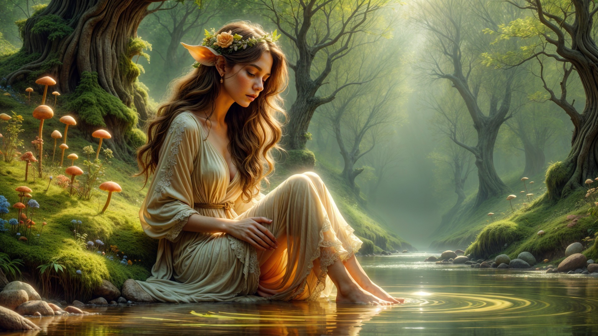 Prompt: A mystical forest scene featuring a beautiful elven woman with flowing, wavy brown hair and delicate pointed ears. She is sitting gracefully by a serene stream, surrounded by lush greenery and vibrant wildflowers. Wearing a flowing off-the-shoulder dress with intricate lace details, the dress is light and ethereal, flowing elegantly around her knees. The soft colors of her garment harmonize with the earthy tones of the surroundings. The forest floor is adorned with colorful mushrooms and fallen leaves, while gentle sunlight filters through the trees, creating a magical atmosphere. The elven woman is playfully dipping her toes into the water, embodying a sense of tranquility and connection with nature.