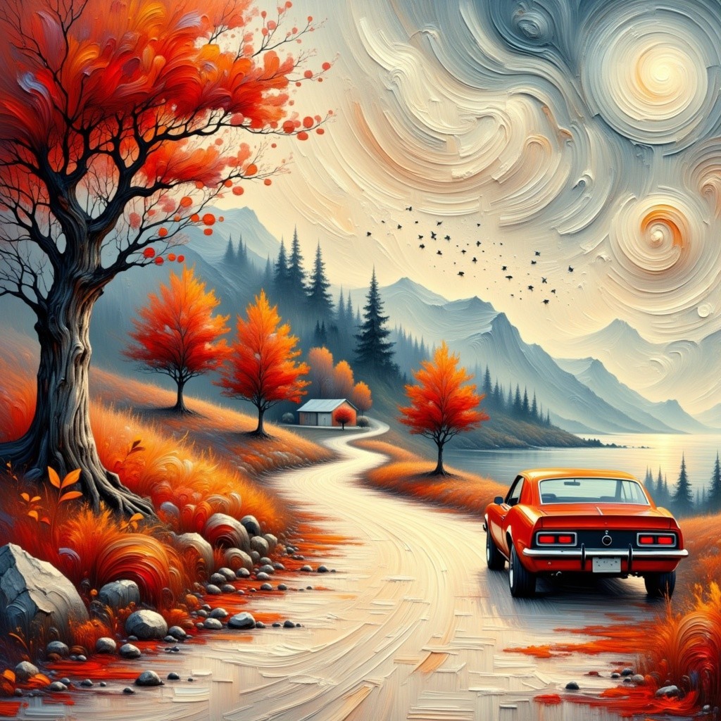 *The most beautiful autumn scene with a steep winding path paved with white pebbles that Has a 1968 Chevy Camaro on it and passes by the sea and by the trees that are richly decorated with green, red and yellow maple leaves. A flock of birds flying to the south. Windy weather, expansive view of the undulating sea, serene and picturesque.