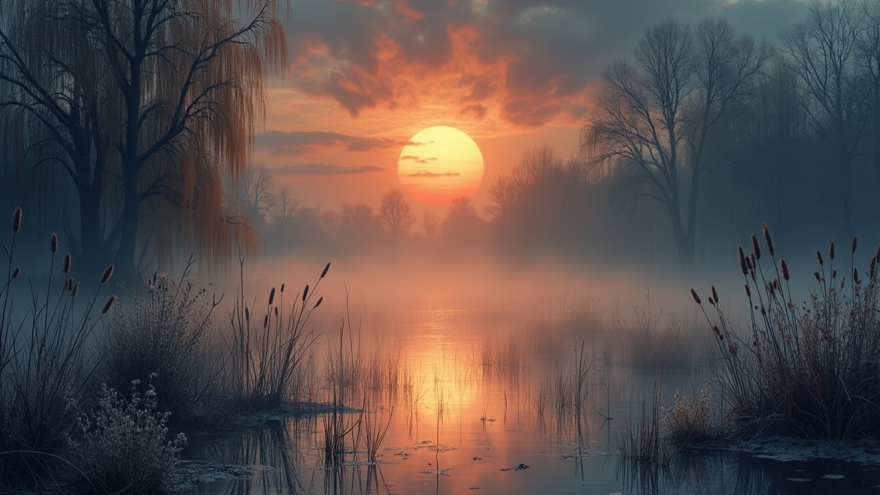 Prompt: Misty evening, willow trees, icy grasses and cattails in front of a large, dull setting sun and a heavy storm front is approaching - front view - digital painting, elegant, extremely detailed, award-winning, sharp quality, swamp background, ink TNT - anatomically correct - full view - photorealistic