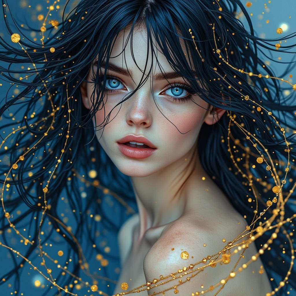 Prompt: Seductive blue-eyed woman with flowing black hair, Fibonacci sequence-inspired composition, intricate wet textures, detailed eyelashes, makeup enhancing features, subtle bokeh background, rich colour palette of blue, black, and silver, dramatic lighting to set the mood. Ethereal and whimsical portrayal in watercolour and ink, intricate golden patterns and strings weaving through the image, graceful pose with delicate gold specks shimmering.