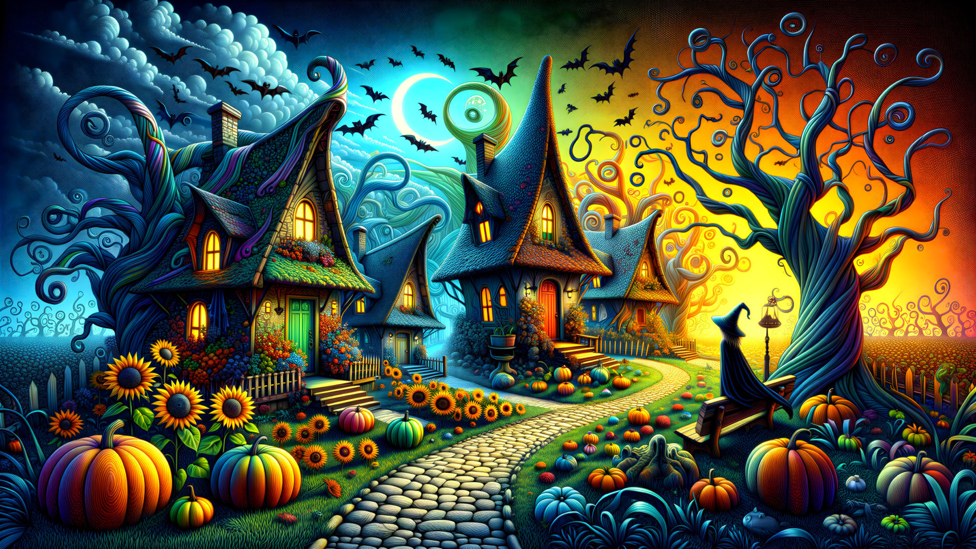 Prompt: Colorful Ink and pale alcohol splatter mixed with messy oil paint brushstrokes hand drawing of rickety whimsical storybook witch houses with crooked roofs and chimneys, flowering front yards, bizarre twisted crooked trees, sunflowers and pumpkins, one witch with a black cat perched on her shoulder, intricately textured, paved path, grasses, stream, by Susanne; Gabriel Pacheco, Jamie Heiden and Catrin Welz-Stein stylization, mystical whimsical patchwork scene in collage-style under a night sky with a crescent moon, surrounded by flying abstract bats against a textured blue-to-yellow gradient background. In the style of Dali, Alex Gray, Michael Cheval, surreal, vivid colors, masterpiece, best quality AI art, diffuse lighting, ambient occlusion, Polished, Masterful Surrealism, Photorealistic, unreal engine, 128K, UHD, crisp quality, light reflections, RHADS, atmospheric, 3D texture, 3D shading, ultra 3-dimensional effect, octane render, volumetric lighting, highest quality AI art, classic composition, rich texture and color, peyote vibe