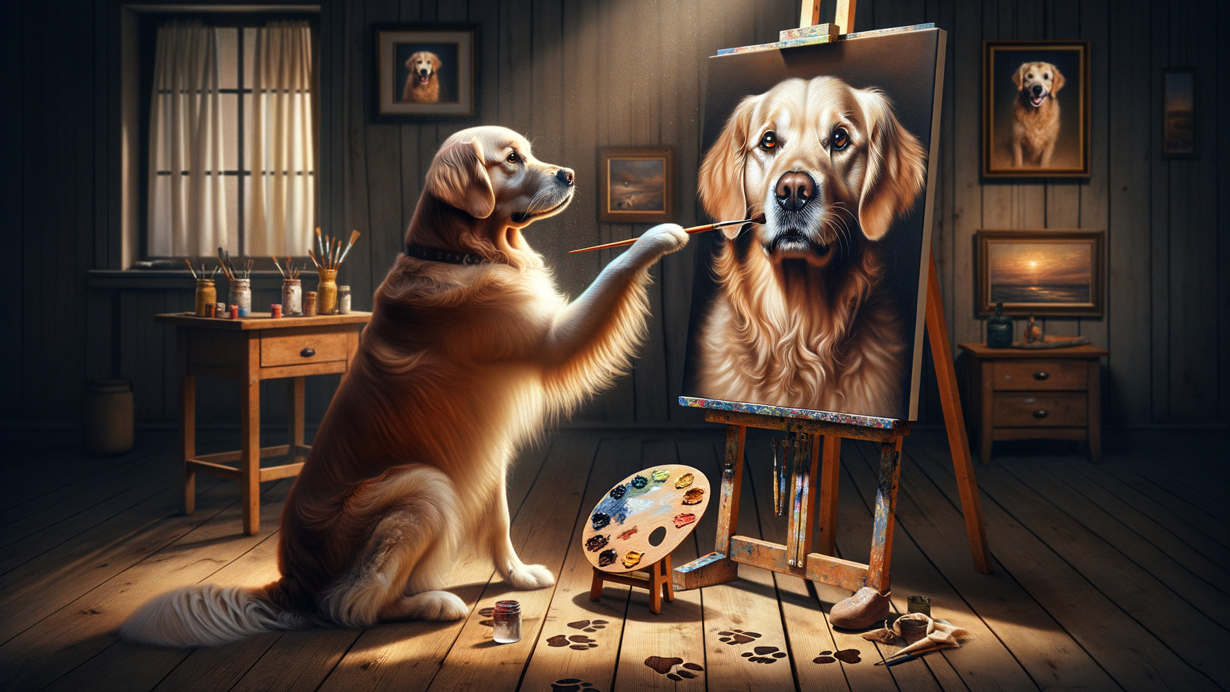 Prompt: Oil painting, with detailed brush strokes: A golden retriever sitting upright before an easel, its paw gripping a paintbrush dipped in rich brown pigment. On the canvas rests a remarkably precise mirror-image self-portrait: the same intelligent eyes, the same slightly lopsided ear, and the same splash of white fur on the chest. A palette smeared with earthy tones lies beside the dog, while faint paw prints trail across the wooden studio floor. Natural light streams through a nearby window, illuminating dust motes dancing around the focused artist and its uncanny reflection.
