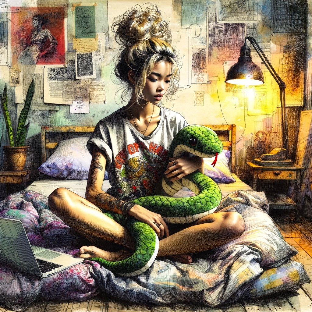 Create a image featuring a very beautiful blonde busty slender urban young vietnamese woman with a messy bun sitting crosslegged on a unkempt bed, embracing a 2 meter long fluffy green toy snake, she dreamily lifts her face up with closed eyes and a slight smile. Next to her stands a laptop.