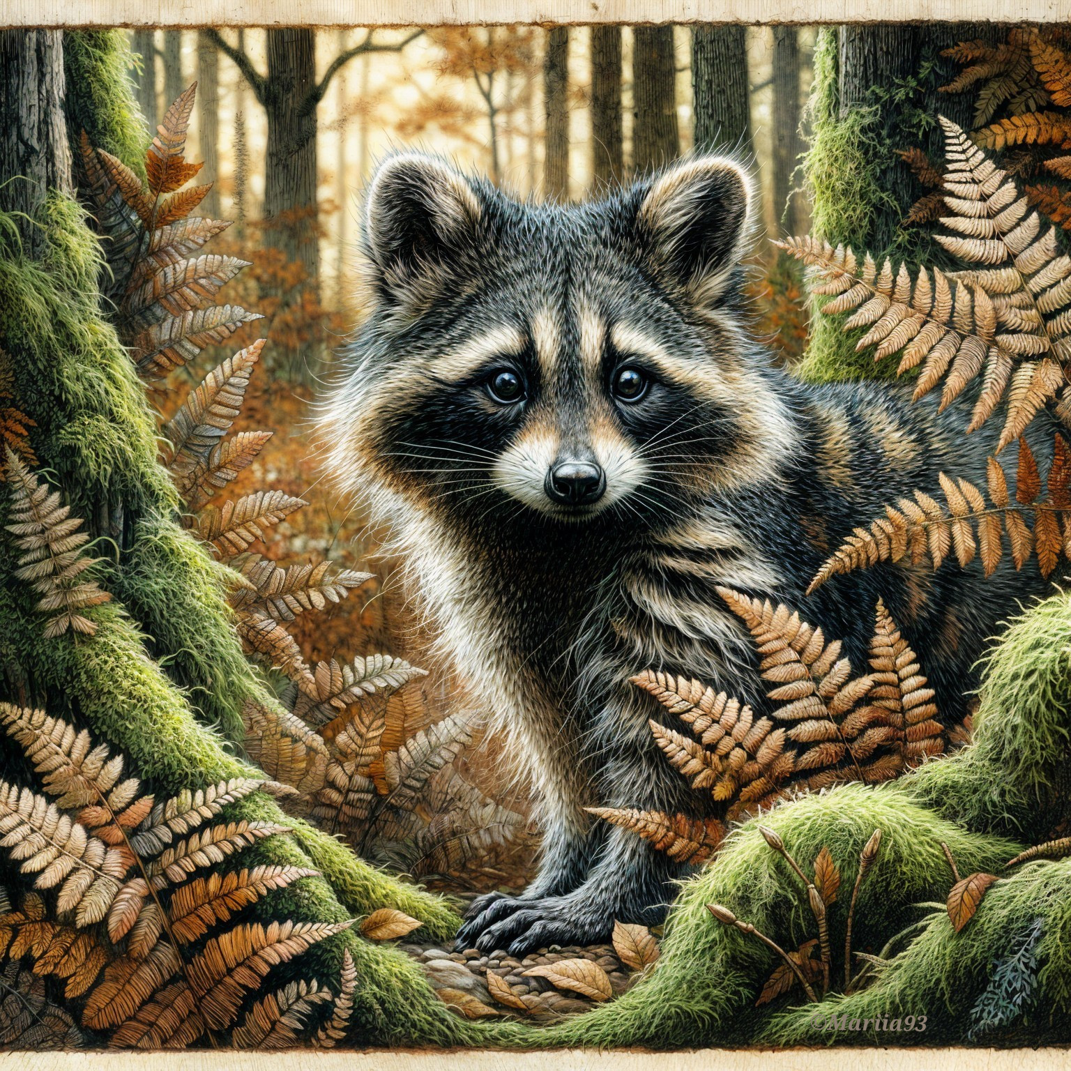 Prompt: A mixed-media picture of an autumn forest, created in the style of Bohdan Pylypiv — combining pyrography with delicate watercolor accents. The main outlines and facial features are rendered with fine woodburned lines, rich in sepia, black, grey, green and brown tones and texture, pastel colors