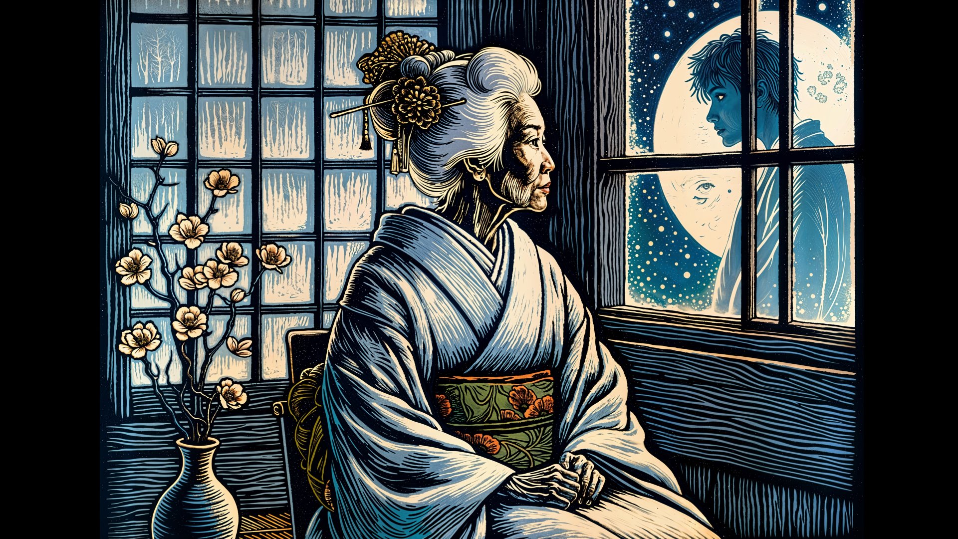 Prompt: Full-screen, complete width, broad, 16:9 format of a delicate linocut with bokeh edges, rich colors, executed on rough handmade paper of poem number 56, Izumi Shikibu, of the Ogura Hyakunin Isshu: "Among my memories / or this world, from whence / Iwill soon be gone, / oh, how I wish there was / one mor meeting, now, with you!" We see a close-up of an very old but regal and elegant Japanese woman in profile. She has gray hair elegantly captured in a bun and is wearing loose, elegant, contemporary clothing. She has all the bearing of a noblewoman as she sits in front of a window at night, gazing out. The window captures a ghostly reflection of a former lover, a very handsome, 20-something Japanese man. The reflection is a projection of the Japanese woman's memory of her lover. The setting is contemporary, in a stark apartment with simple furniture and a single vase with an artfully arranged floral display. Wistful, melancholy, end-of-life atmosphere. The image is rendered as an exceedingly detailed, highly symbolic, large, zentangle-like linocut with enormous detail. Clarity of rendering, timeless, symbolical motif. Masterful technique. Exquisite Japanese folio.