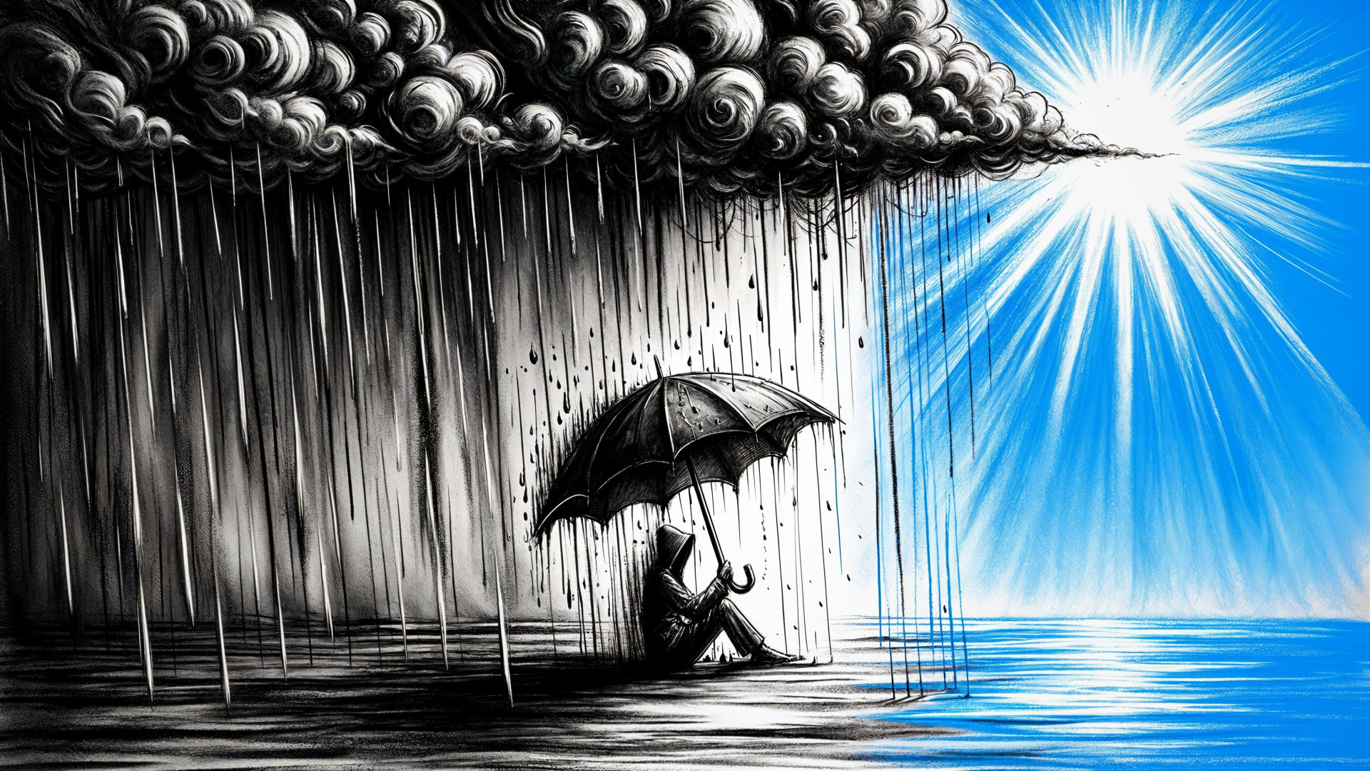 Prompt: Lonely little girl, umbrella in rain, dark storm cloud, contrasting sunny blue sky, charcoal and ink illustration, touch of color, black and white with blue accents, emotional, expressive strokes, detailed features, somber atmosphere, subtle hint of hope, ArtStation.