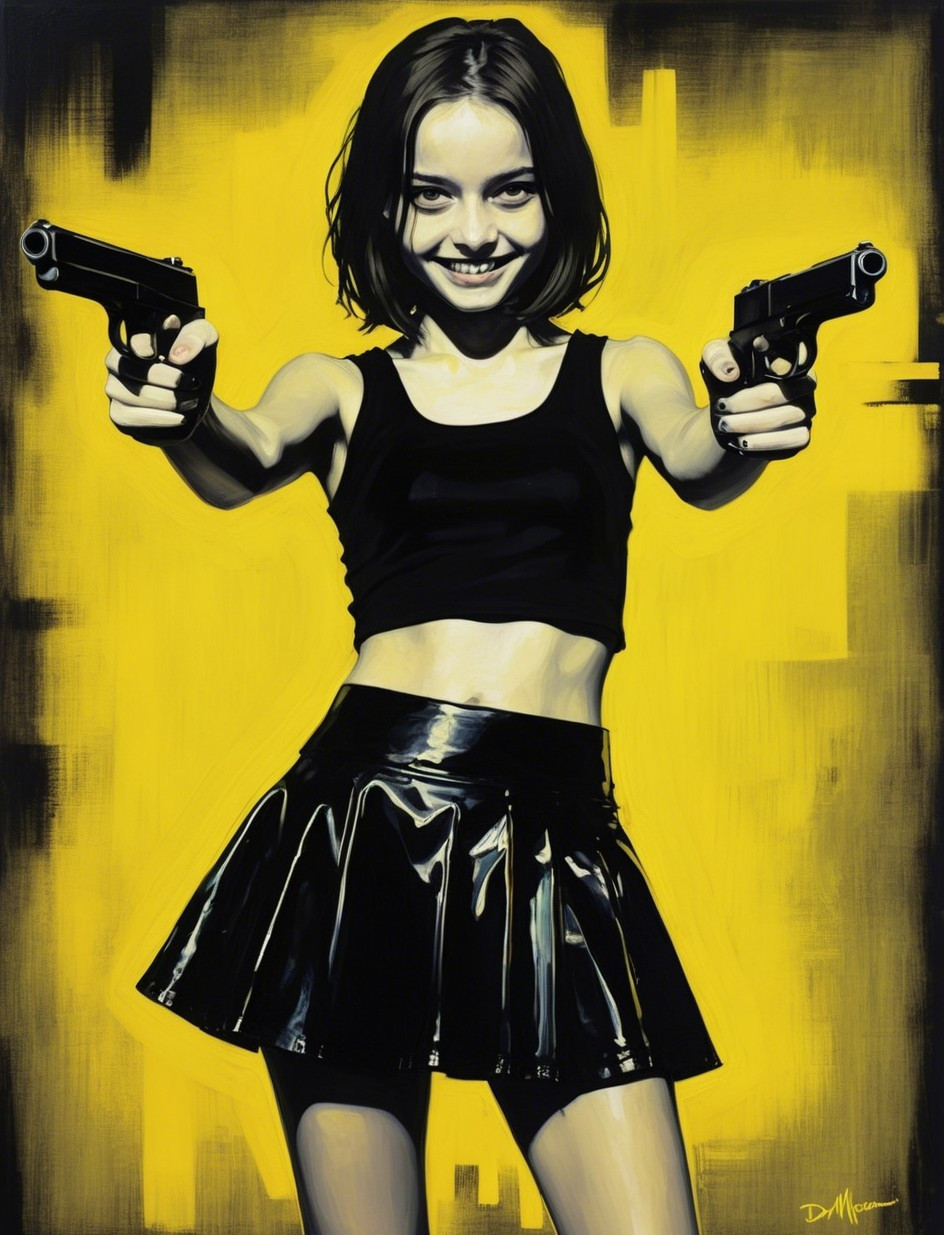 Prompt: portrait, girl with mischievous sly smile pointing two guns at the viewer, skirt and tank top, dark, abstract, ominous, yellow background, style of Dave McKean, Christopher Bucklow, Stephen Gammell and Jeremy Mann