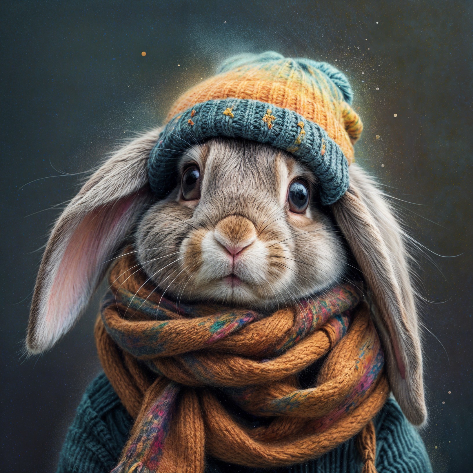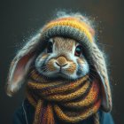 Prompt: A close-up of a whimsical, lop-eared bunny with large expressive eyes, wearing a scarf and a beanie, featuring colored pencil and painterly effects with unique details and splattered accents. --ar 3:4 --v 7