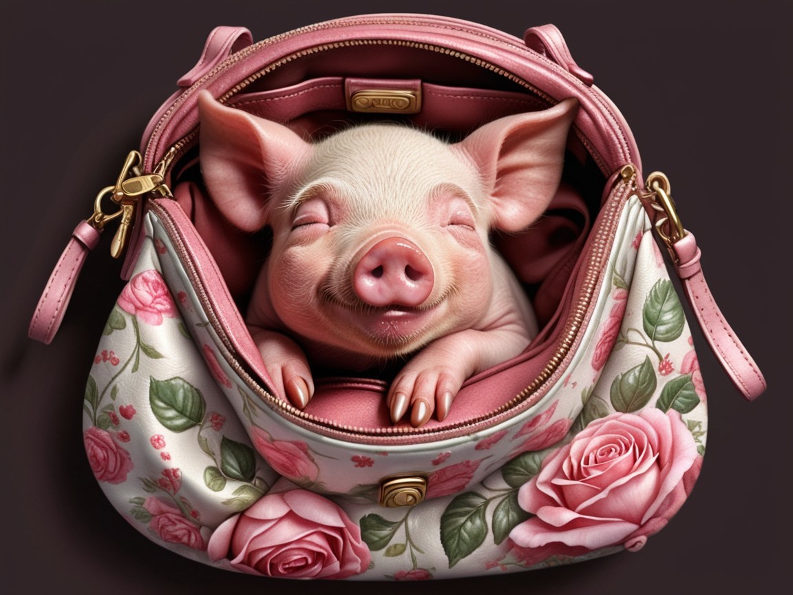 Prompt: An adorable little piglet is curled up in the outer pocket of a beautiful purse. The pig looks content and comfortable in his sleeping arrangements. In the style of Jan Brett, Jean-Baptiste Monge.