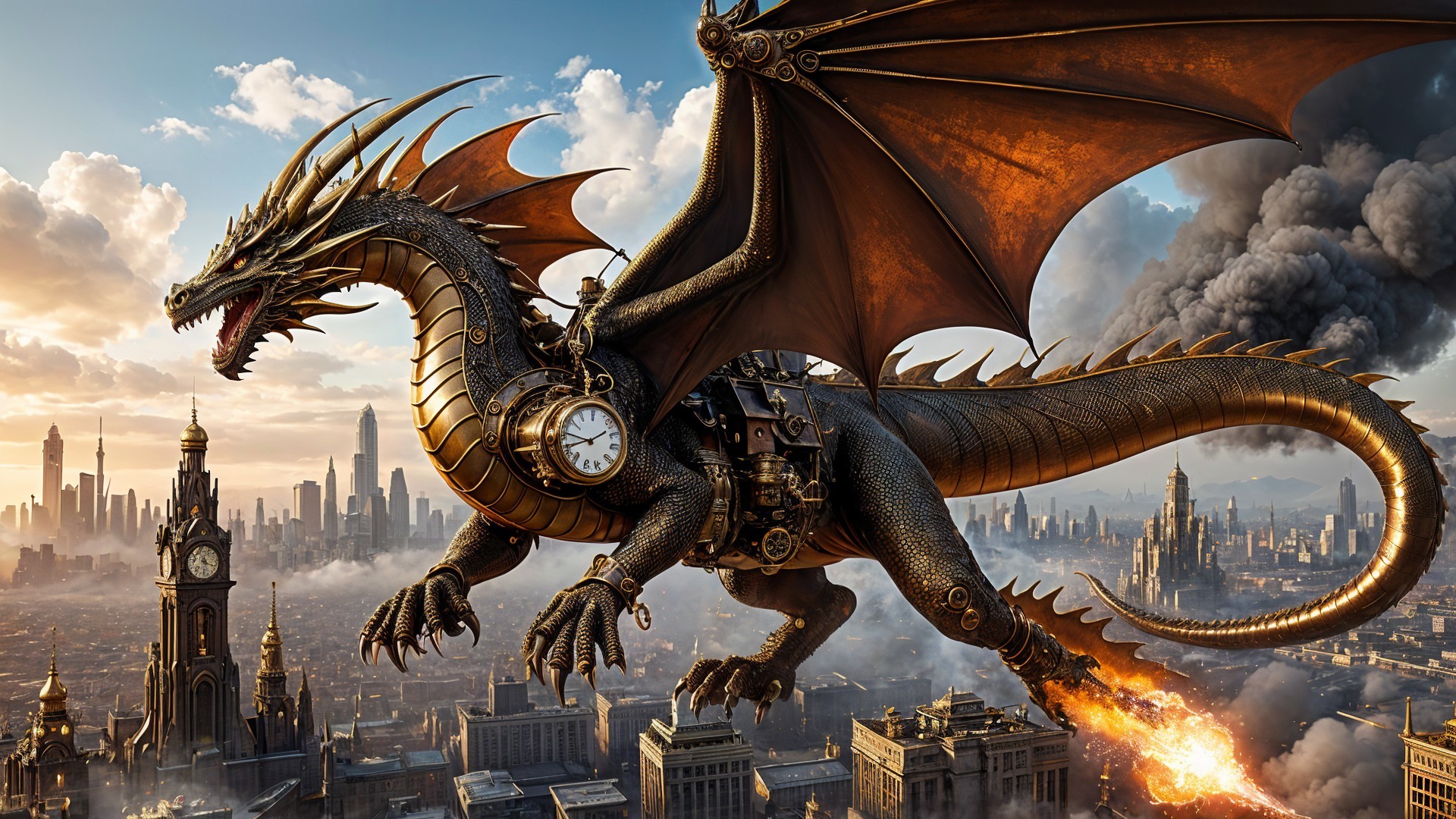 Prompt: An intricate, clockwork dragon, its scales made of polished brass and copper, soars through a sky choked with smog and industrial fumes. Below, a sprawling steampunk city with towering, gear-adorned skyscrapers is under siege by an unseen force, with explosions illuminating the night. The artwork is in the style of a highly detailed steampunk illustration, with a touch of surrealism in the city's impossible architecture.
