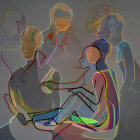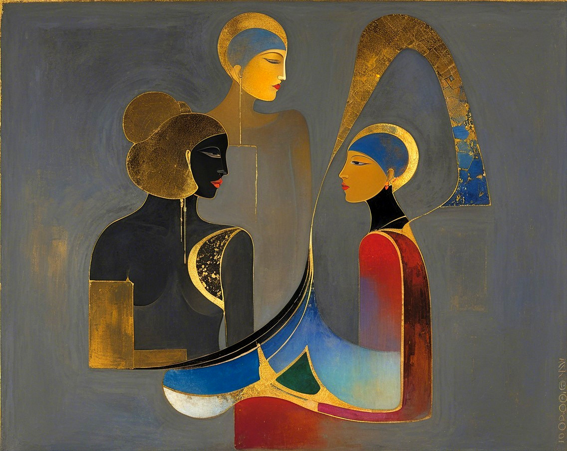 Prompt: People. Odilon Redon's dreamlike surrealism. Kintsugi paintings of abstract squares create a mesmerizing design. The background is a landscape of lines of code, data strands, and geometry. Warm, golden light seeps through the gaps. Alcohol ink bleeds along the edges. A masterpiece of the highest quality and detailed mixed-media art. Vibrant black earth tones, thick, heavy texture, expressive brushstrokes.