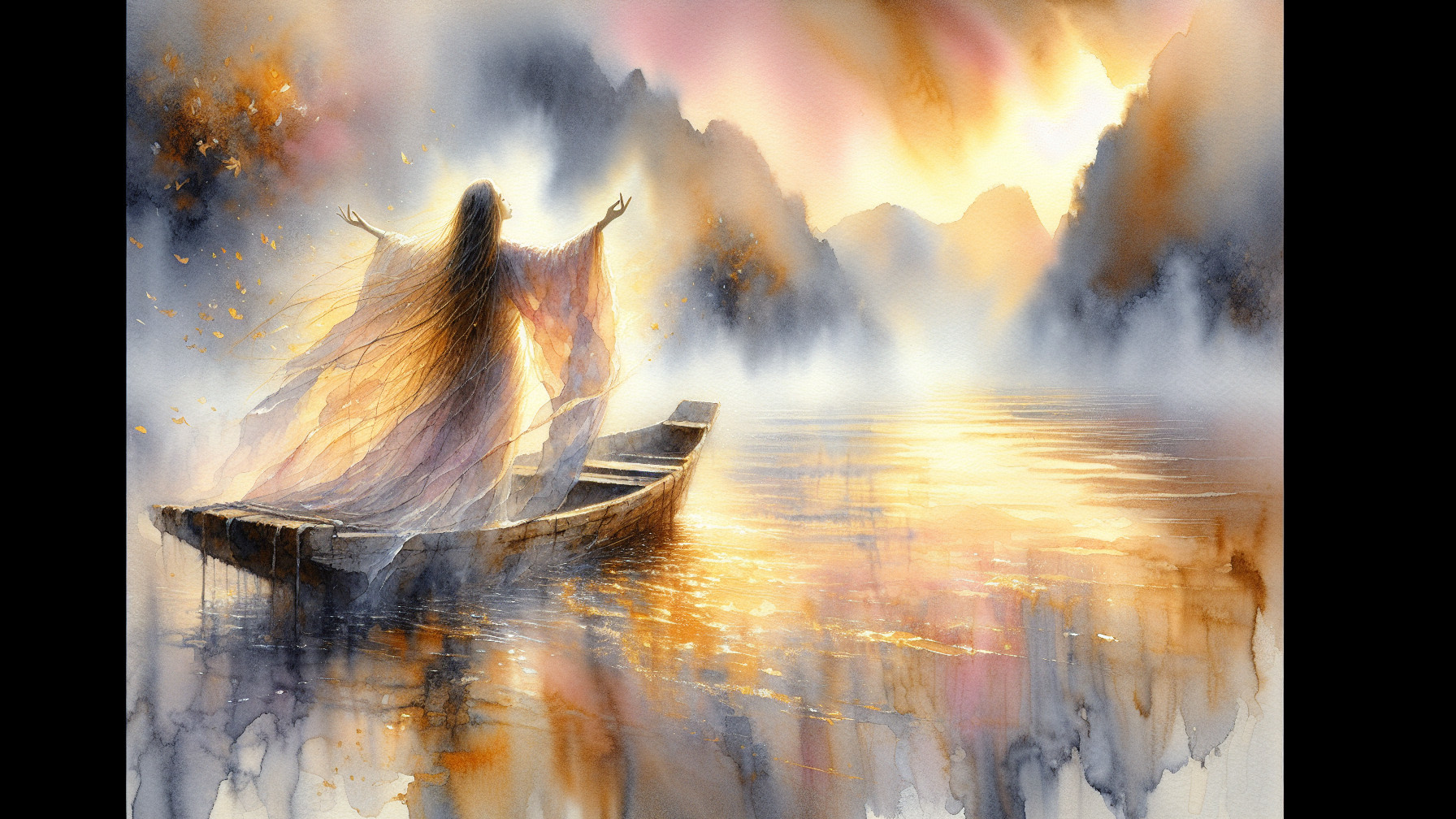Dreamy hazy breezy wet-on-wet watercolor painting. Minimal paints, maximum loose watery effects, with translucent washes creating a soft, ethereal mist and bleeding sunrise hues. EmmAI palette of luminous golden-pink, soft peach, and cool, profound river blues. A poetic composition featuring an ethereal beautiful East Asian female figure in a small wooden boat, arms open towards a sky adorned with subtle golden-pink. He long windswept hair catching the golden flecks of luminous sunrise. Her form should be delicately rendered, dissolving into the misty air, reflecting a deep spiritual awakening and surrender. The background mountains fade into abstraction. No text, no artifacts, no harsh lines.