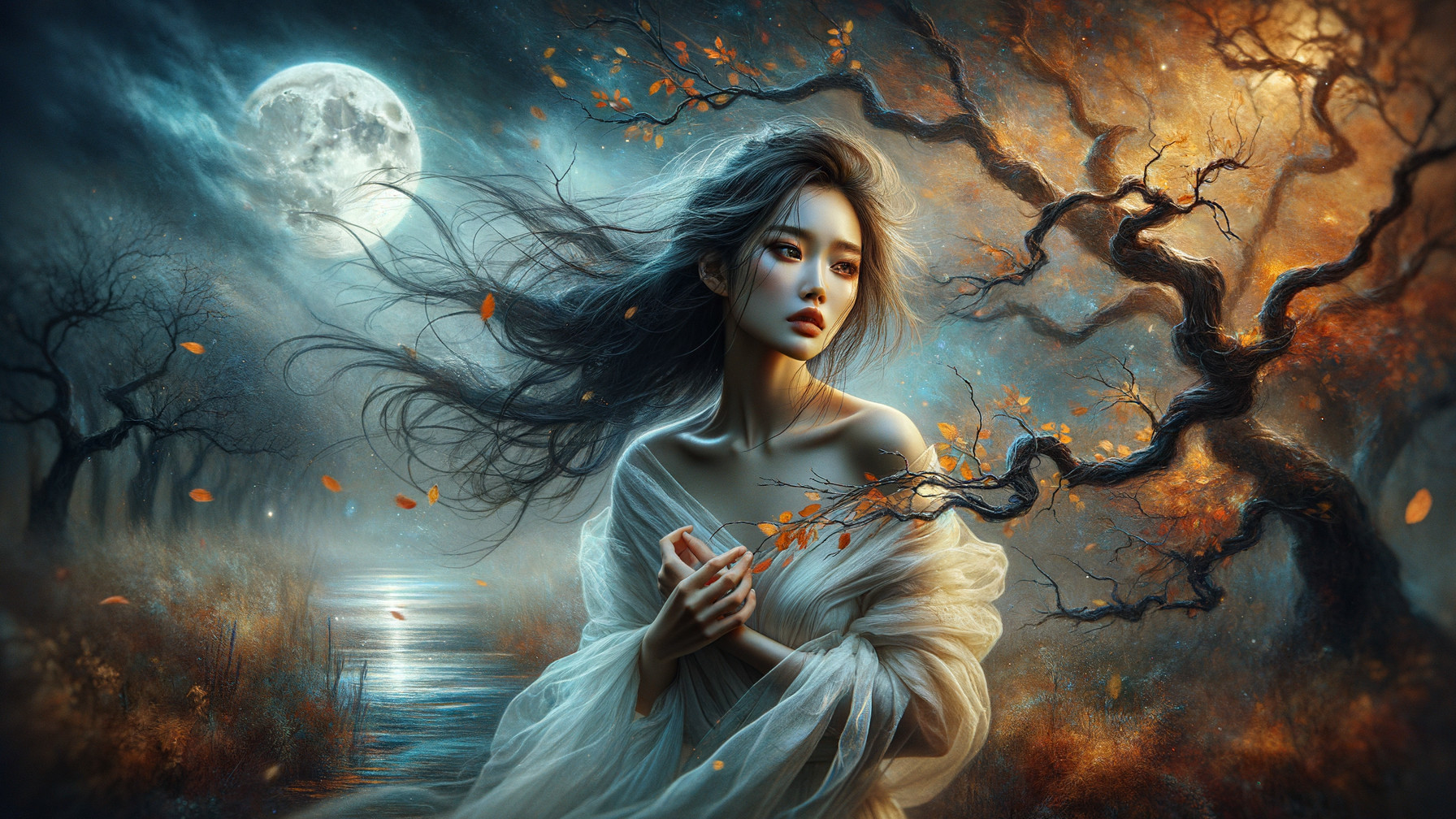 Prompt: An ethereal beautiful East Asian young woman, dark hair blowing in the wind, beautiful but sad hazel eyes, luminous white silk dress, lost in an autumn forest in her dream that depicting a dramatic landscape scene featuring a large full moon illuminating a dark, cloudy sky. The foreground showcases a barren tree with twisted branches, dramatically swaying in the wind. Vibrant orange and yellow leaves are spiraling off the tree, creating an artistic contrast against the dark, moody colors of the background. The setting should be near a calm body of water, reflecting the atmospheric elements, enhancing the melancholic feeling of movement and transition between day and night, lost and found, fear and hope, reality and dreams.