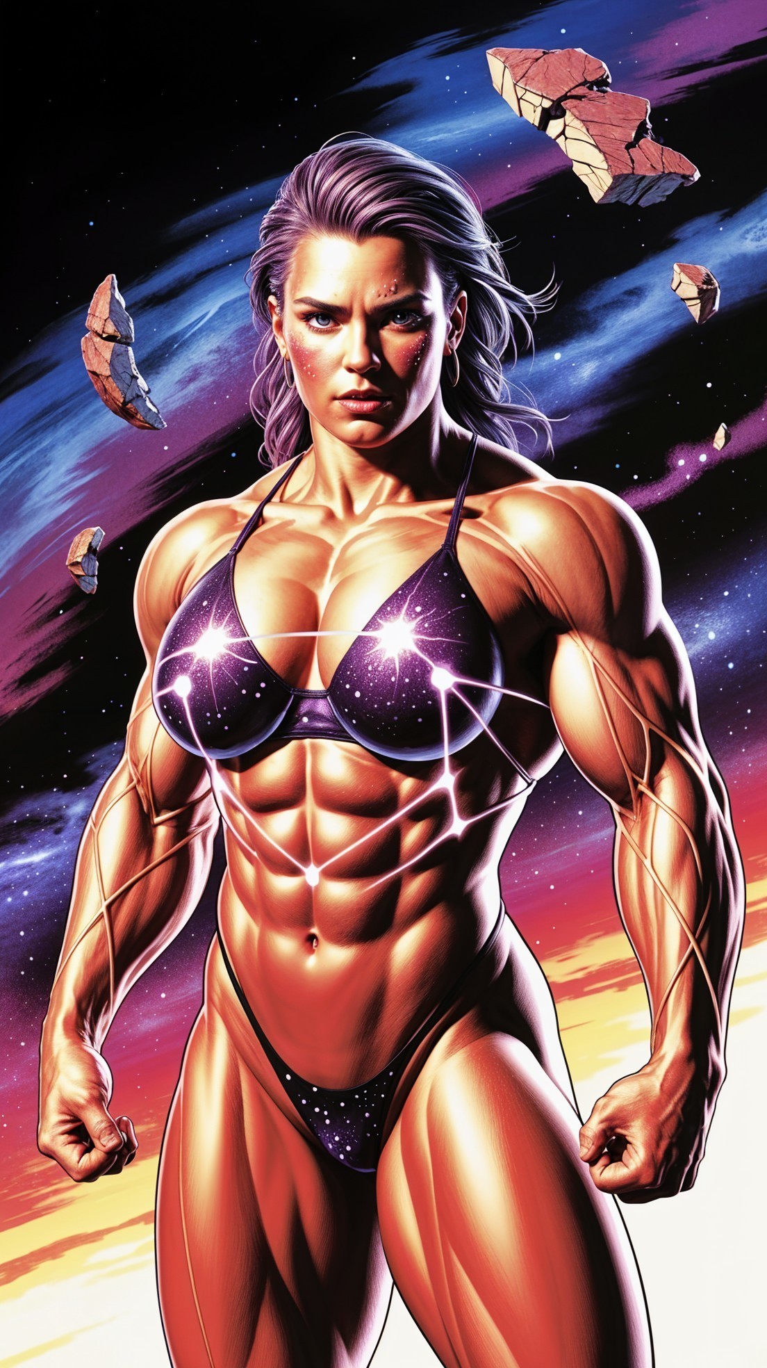 Prompt: Turn this image into Concept Art illustration Portrait with the Art style of JoJo no Kimyō na Bōken Ōgon no Kaze feature Female bodybuilder as a Otherworldly Super powerful cosmic being,but keep this image at its original source with fully detailed accuracy
