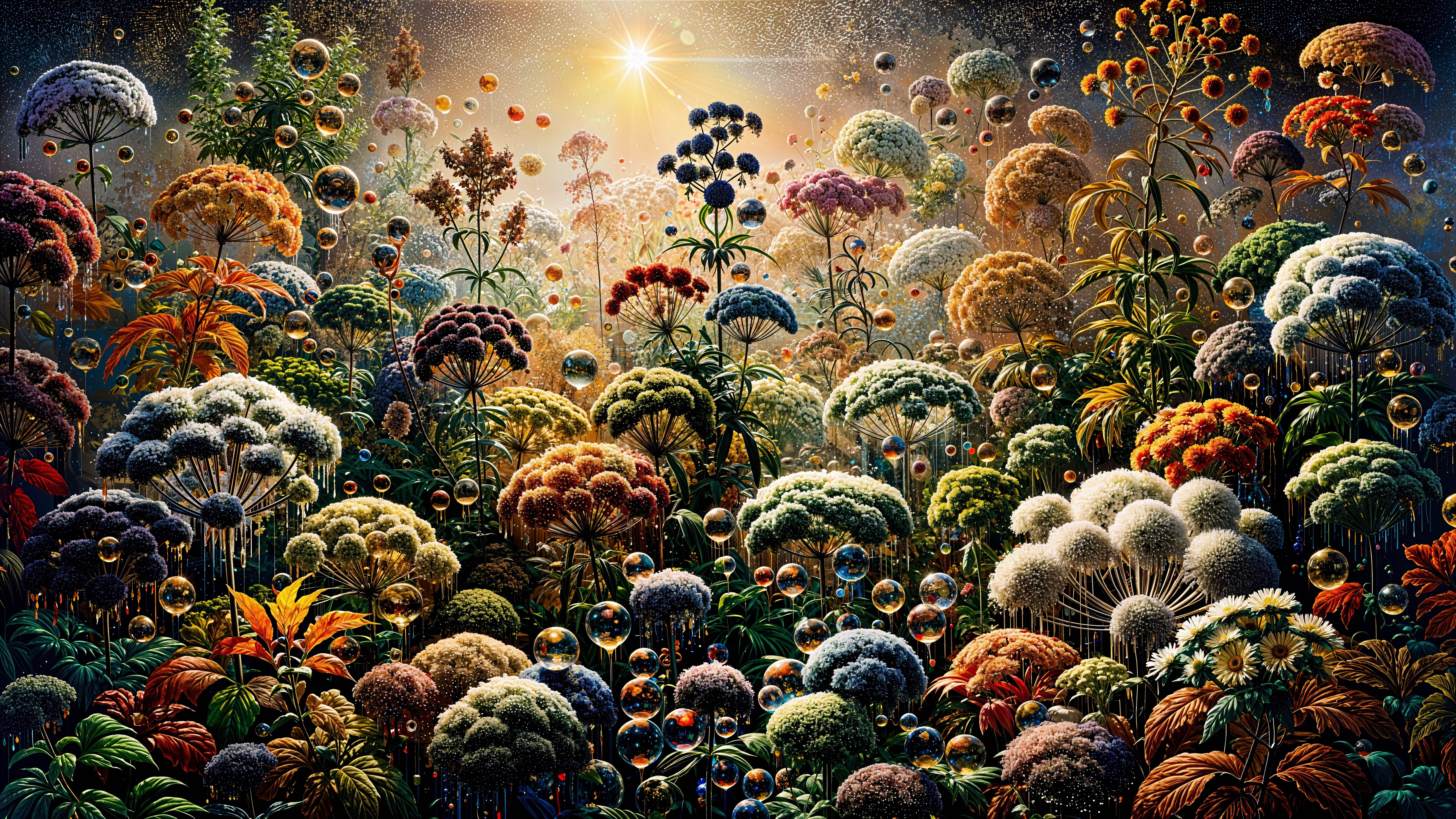 Prompt: Full-screen, complete width, broad, 16:9 format of an extremely detailed vanitas-type oil painting of poem number 75, Fujiwara no Mototoshi, of the Ogura Hyakunin Isshu: "As dew promises / New life to the thirsty plant, / So did your vow to me. / Yet the year has passed away, / And autumn has come again." Dew richly covers a flowerbed of Japanese mugwort (Artemisia princeps), glittering and shimmering in the early morning sun, breaking the light into rainbow colors. The dew stands for a promise - which, alas, was later broken. But in this image, the hyperrealistic dewdrops, each reflecting and magnifying the leaves next to it, present a breathtaking spectacle. Painstakingly detailed, hyperrealistic oil painting in the technique of the old Dutch vanitas masters. The vanitas concept embraces the fleeting nature of life - like this soon to be broken proomise. Exquisite Japanese foilio.