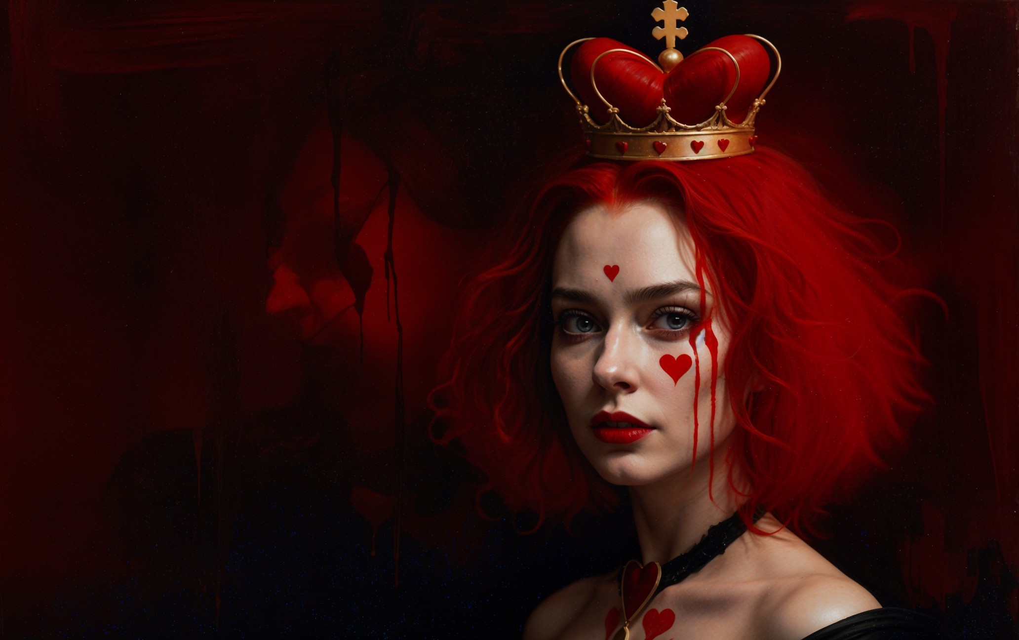 Prompt: portrait, queen of hearts, impasto oil painting, dark, abstract, ominous, style of Dave McKean, Jeremy Mann, Christopher Bucklow and Stephen Gammell