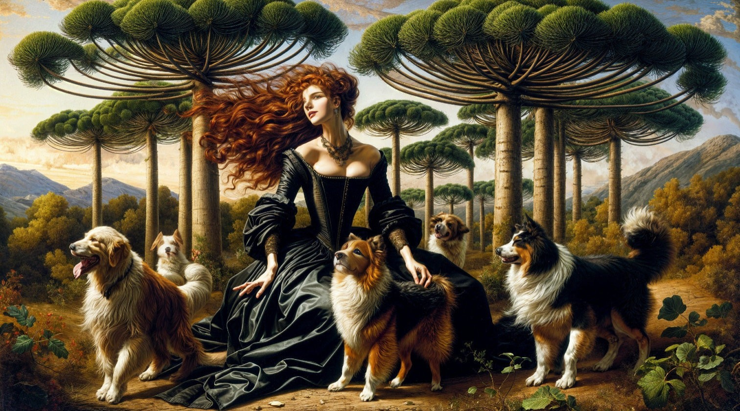 Prompt: A woman with reddish-brown hair stands playing with her dogs under Araucaria trees; the setting is harmonious and elegant. She wears a black Gothic dress, and the light Minuano wind blows through her hair and the fur of the animals playing with her. The work is Renaissance-style, detailed, as if a famous painter had traveled through time and captured the future to place on a canvas of the past. Details on the canvas with gold paint, crackled, without frames, creatively detailed.