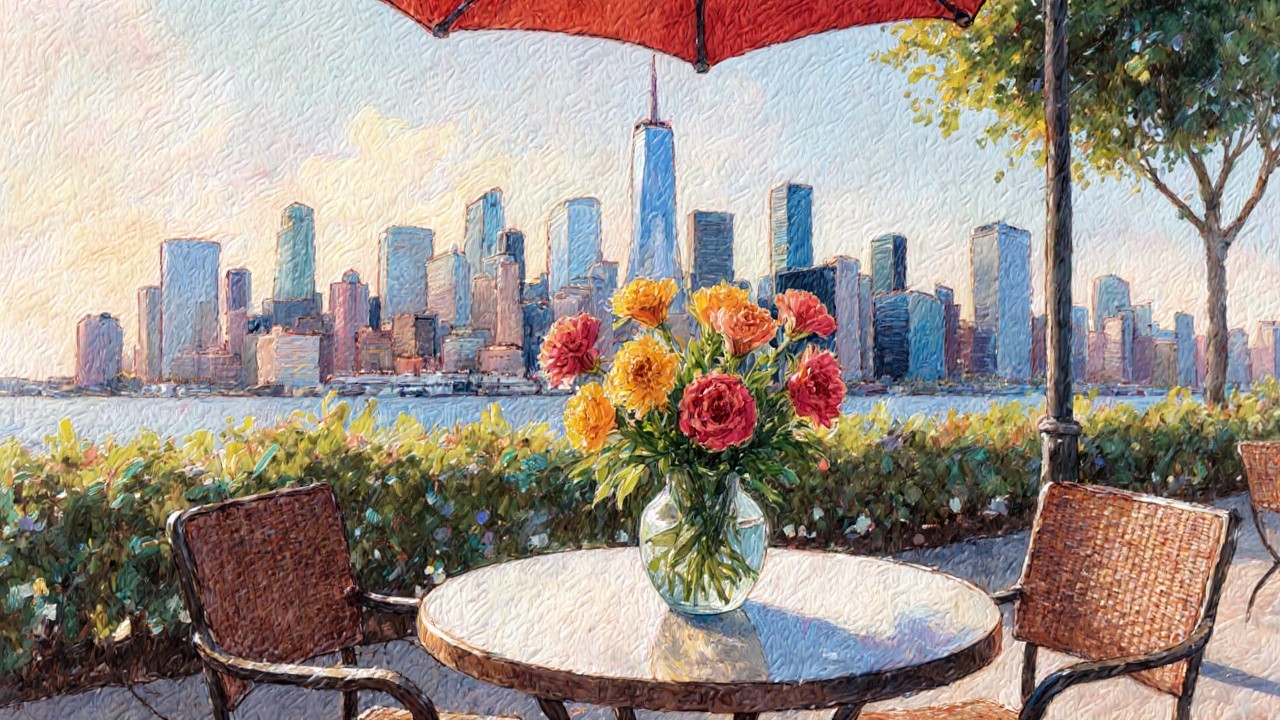Prompt: hand colored extremely scribble art of a city skyline viewed from the perspective of a vase of flowers on a table in an outdoor sidewalk café, high resolution, natural realistic lighting, natural realistic colors, paint hyper textured