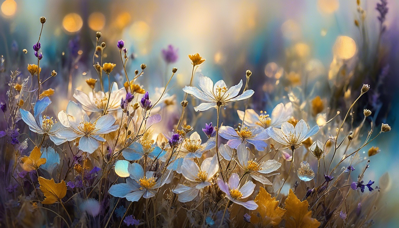 Prompt: delicate ethereal iridescent wild flowers in a prairie, bathed in soft morning light. Golden leaves shimmer in ethereal mist of pale blue and purple, evoking tranquility. macro view of the intricate flowers embraced by fluid, luminous alcohol ink gradients that blend effortlessly into the dreamlike atmosphere. Nature transforms into art, capturing a timeless, sculptural elegance
