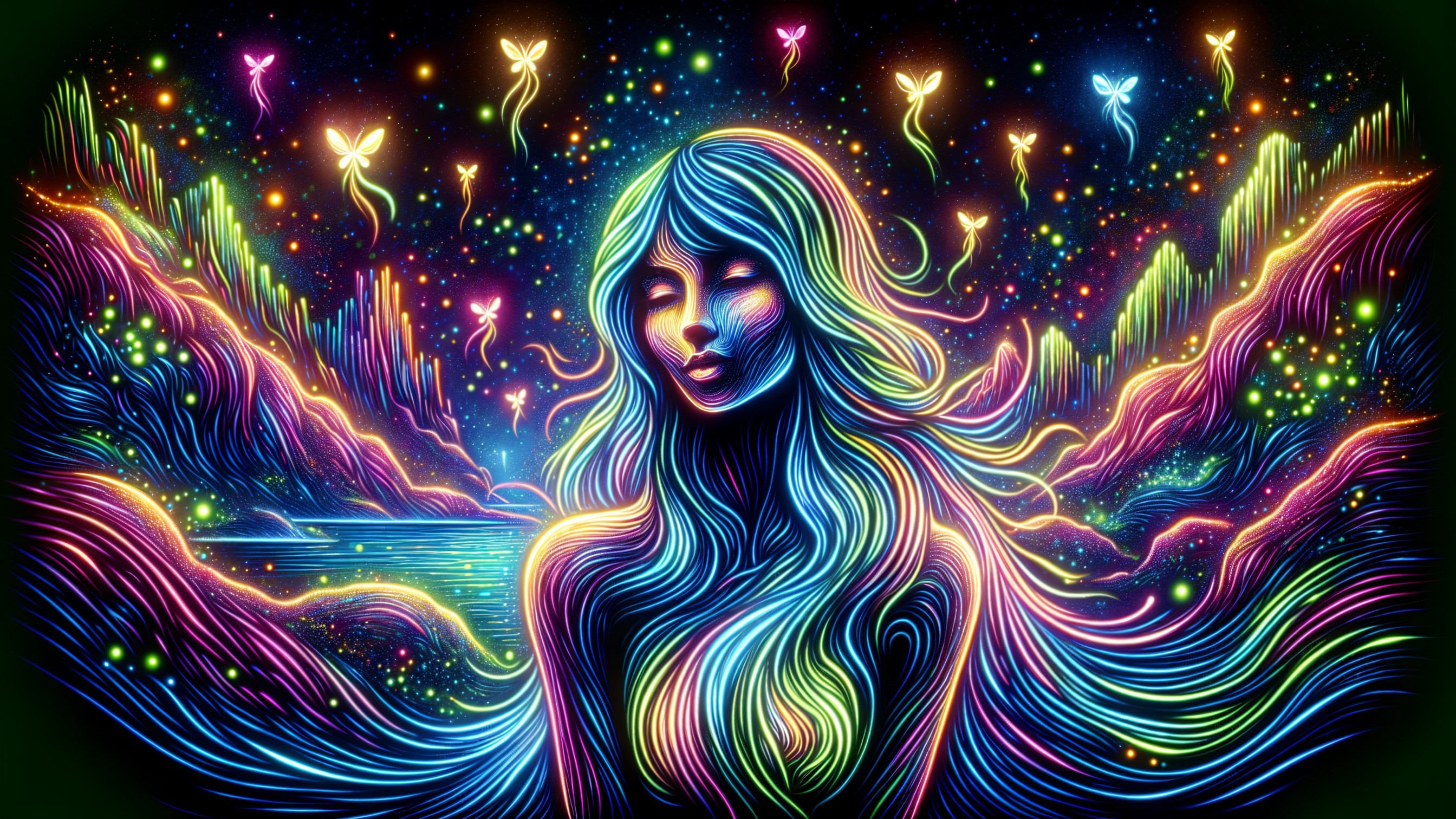 Prompt: A masterpiece of neon abstract impressionism. Astral Beauty. A beautiful, slender astral girl with the perfect curves of a woman's figure and long, flowing hair levitates in an astral world with a stunning, unearthly landscape featuring stunning, multicolored, translucent mountains, glowing lakes, and waterfalls. The girl has a perfectly beautiful face with sparkling eyes and a calm, detached expression. Multicolored fireflies fly around her, and a multitude of bright, radiant stars are visible in the astral sky.