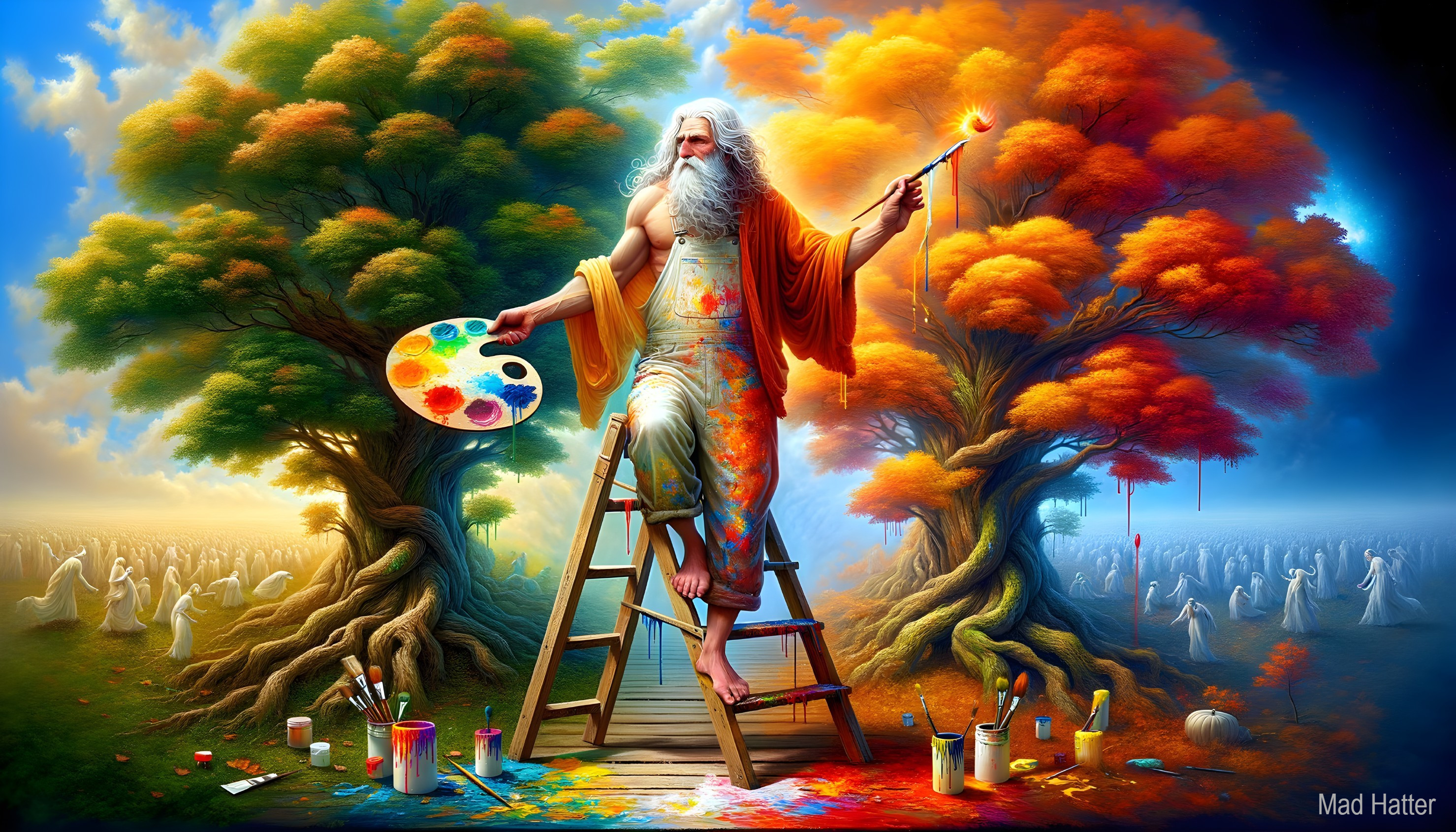 God the painter wears painter's overalls stained with orange and red and yellow paint. He holds a colorful paint palette in his left hand and a artist paint brush with orange and red and yellow paint dripping from the brush in his right hand, appearing to be painting the leaves on the tree from green to red and orange and yellow. Some of the Autumn colored paint is leaking from some of the freshly painted leaves.