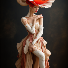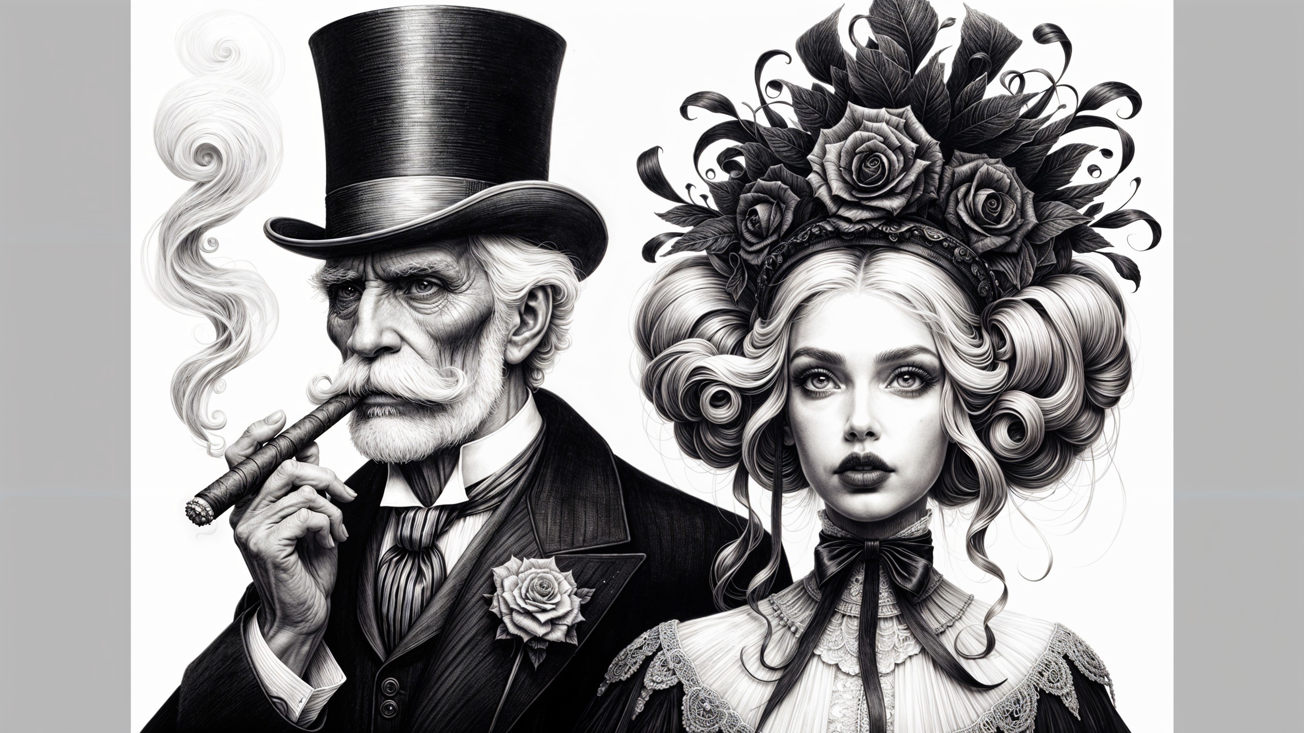 Prompt: Monochrome Vintage drawing of an old man wearing a top hat and smoking a cigar and a woman wearing an elaborate Victorian headdress with flowing ribbons, detailed ink wash artwork in the style of surrealistic grotesque style, whimsical character design, surrealism, surreal composition, ultra-realistic with ultra-fine details, fantasy art in dark white and light grey, with exaggerated facial features on a white background
