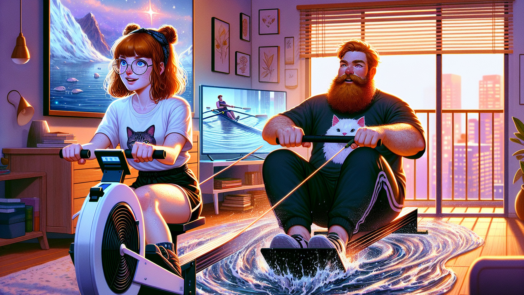 Prompt: (Eine leicht übergewichtige mitteleuropäische frau mit langen feinen rotbraunen haaren, blauen augen und eckiger brille schwarzer kurzer hose und weißem tshirt mit katzenaufdruck) schwebt im wohnzimmer in einem wasserstudel verursacht durch das "waterrower" rudergerät mit dem ein (großer, stark übergewichtiger mann mit kurzem rotblonden vollbart, brille und schwarzer hose und weißem tshirt) trainiert, beide sind verschwitzt, sporttraining, unaufgeräumtes wohnzimmer, großer fernseher mit anime show, stapel von offenen kochbüchern, leuchtender LED-stern am balkonfenster, balkontüre mit jaousien, warmes abendlicht, cell shading