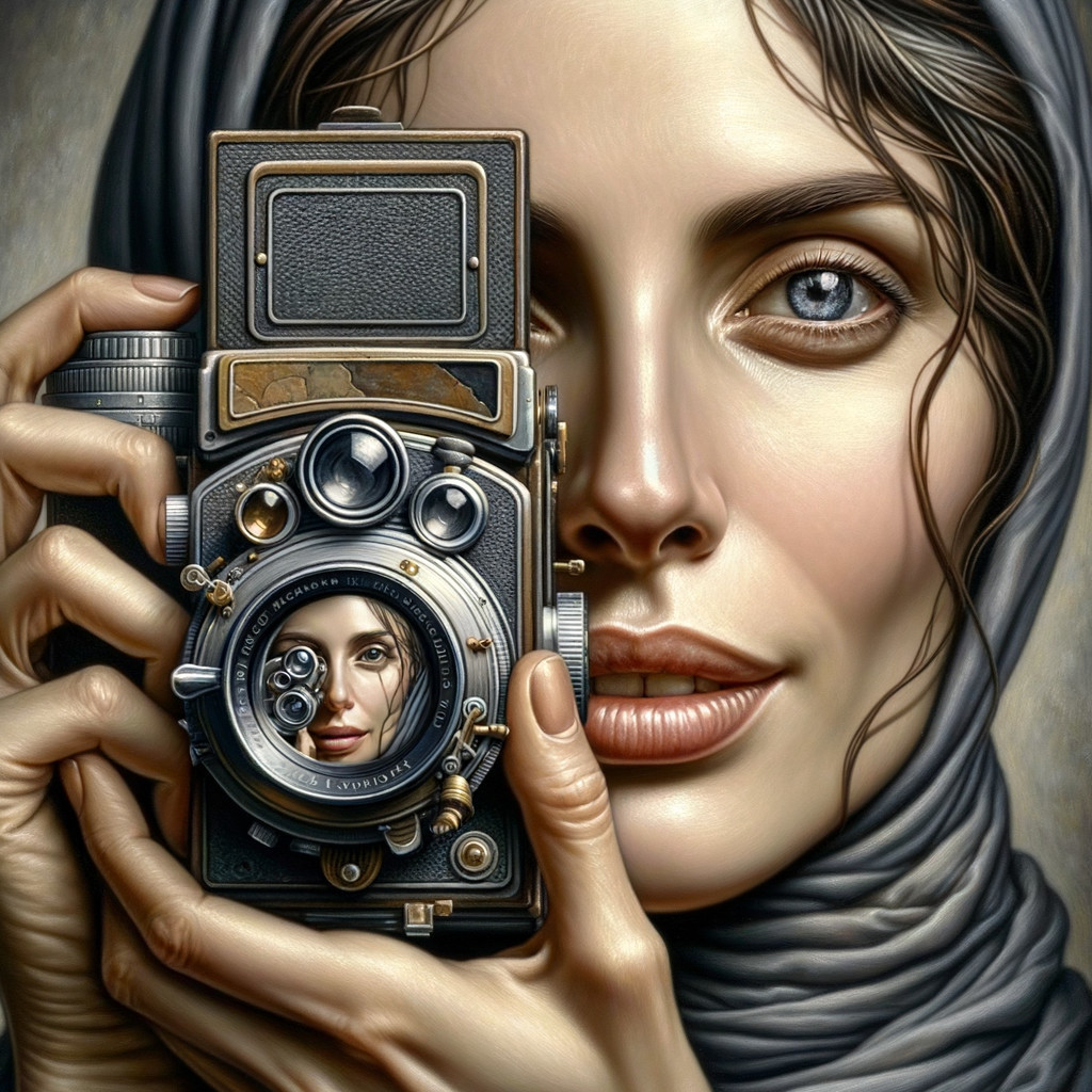 * Woman looking directly into vintage camera lens – as if taking self-portrait