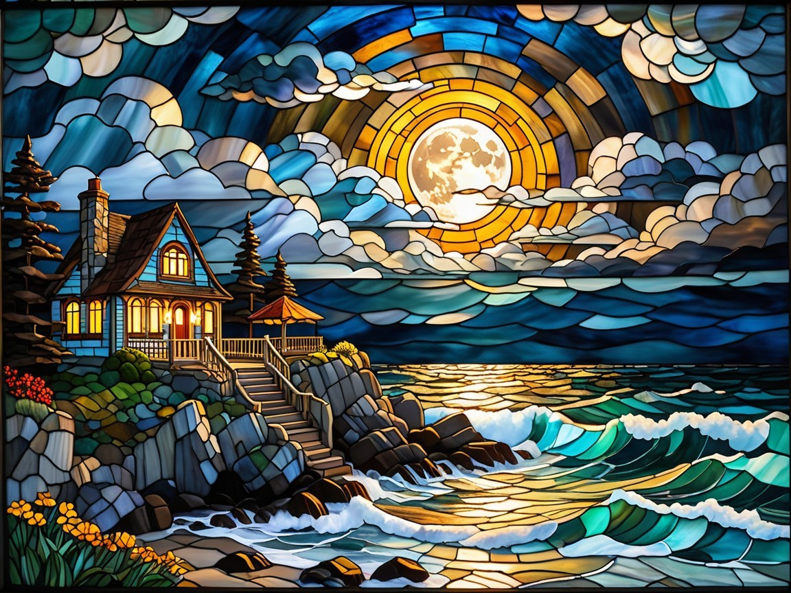 Prompt: There is a stormy sea with crashing waves against a rocky cliff with a cozy cottage atop it with glowing golden windows at night with cumulous stormy clouds partly obscuring a full moon all in Tiffany stained glass.