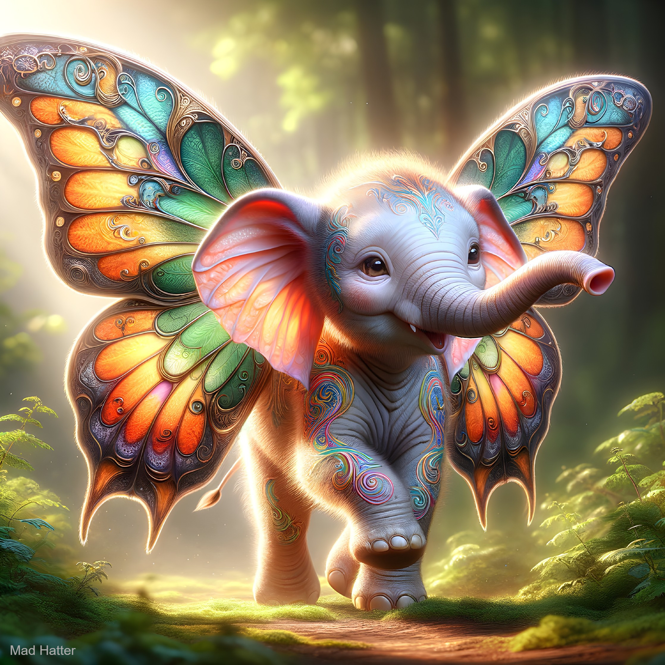 Prompt: An ultra-detailed, ultra-intricate image of a fantasy baby elephant with ears that are butterfly wings. His body has fine colorful tattoo markings like that of a butterfly in the style of Flo ''n Images. His body has colorful & detailed tattooed markings match those of his butterfly wing ears. He has a joyful gait moving through the hendry brush. The soft diffused backlight highlight his butterfly ears