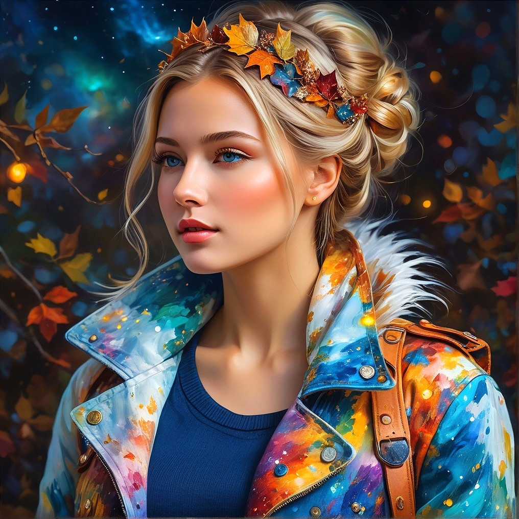 Prompt: Autumnal splashes of color and leaves with magical lights, a wonderful time journey into the ocean of galaxies, a mesmerizing image, fascinating objects and design.