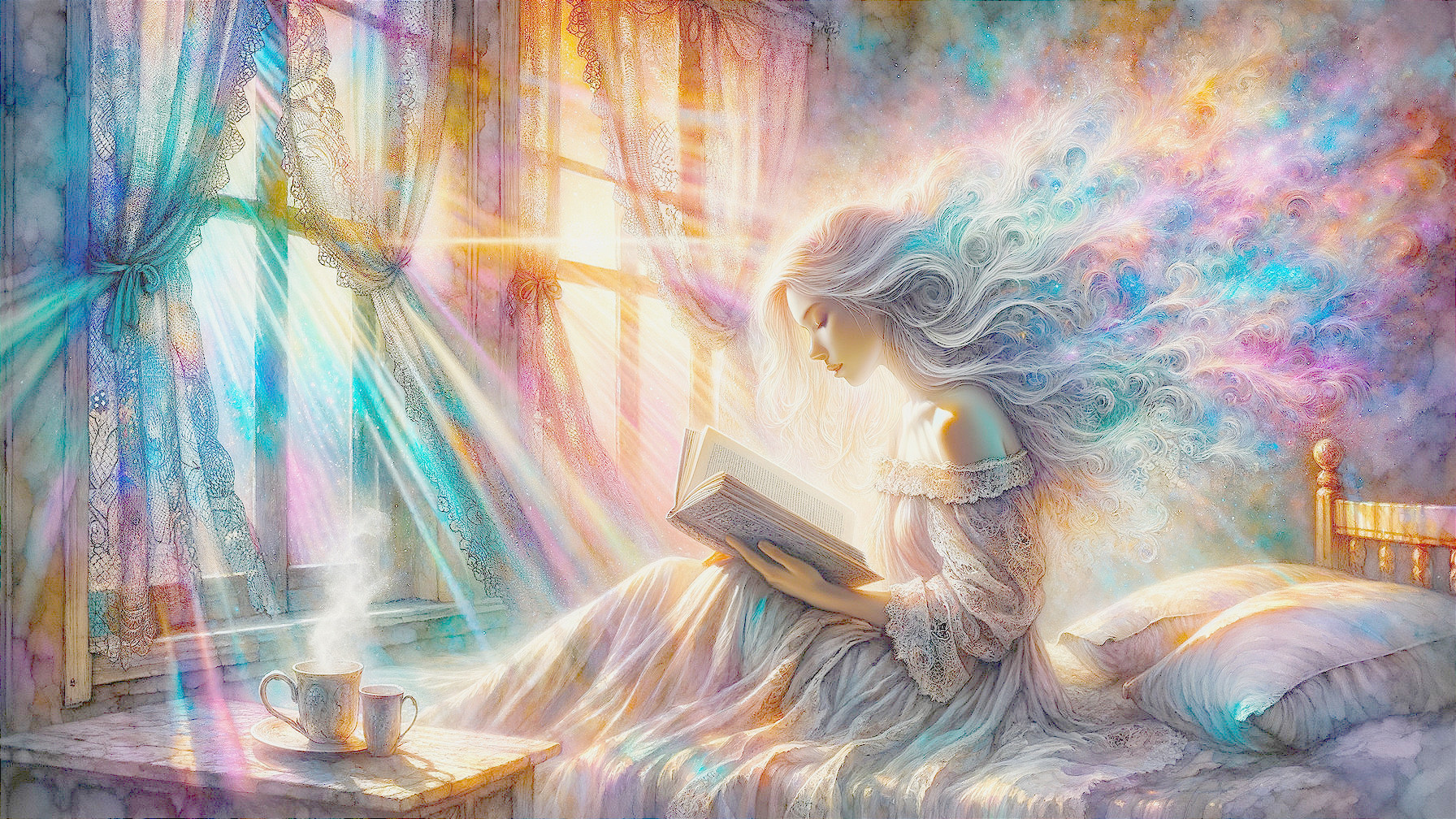 WATERCOLOR, a young woman sits on a cozy bed, leaning against the wall as she reads a thick book, rainbow-colored sunrays stream through long lace curtains, casting soft patterns across the room, a steaming mug of tea rests beside her, enhancing the dreamlike atmosphere, her fluttering hair and delicate features add to the surreal, ethereal vibe
