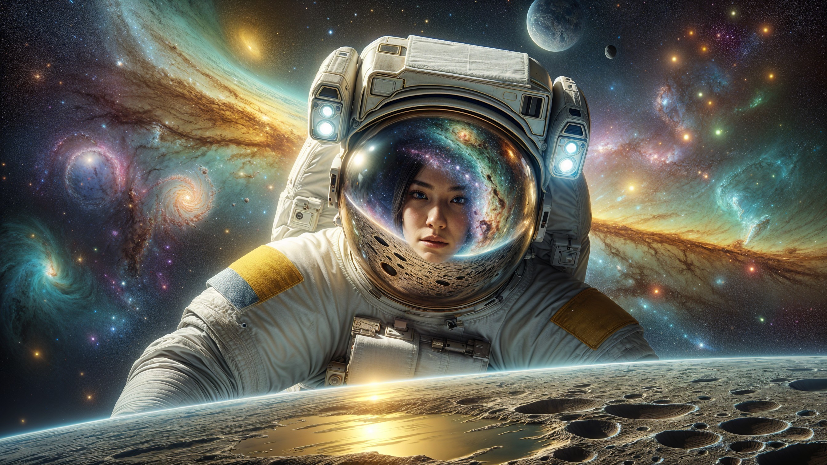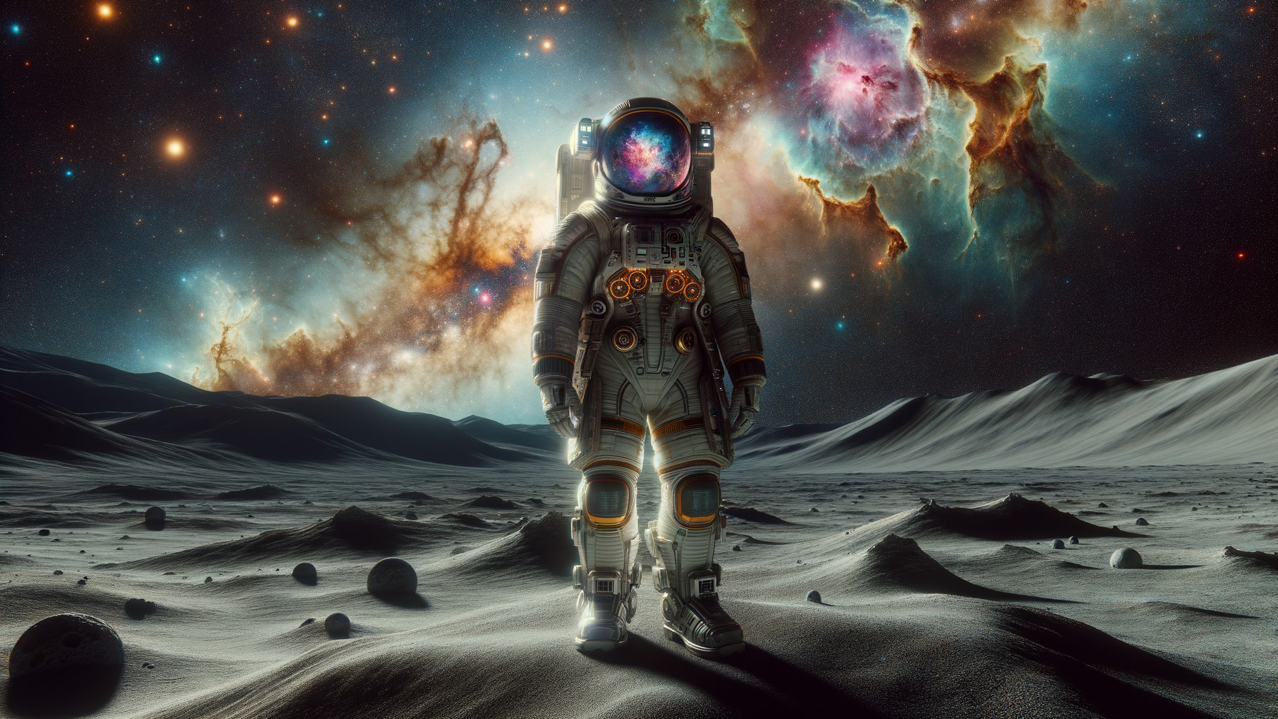 Prompt: Astronaut in futuristic space suit standing on a moon. In outer space. Full body seen. Galaxy reflects in his helmet. Galaxy and colorful nebulas in the background.