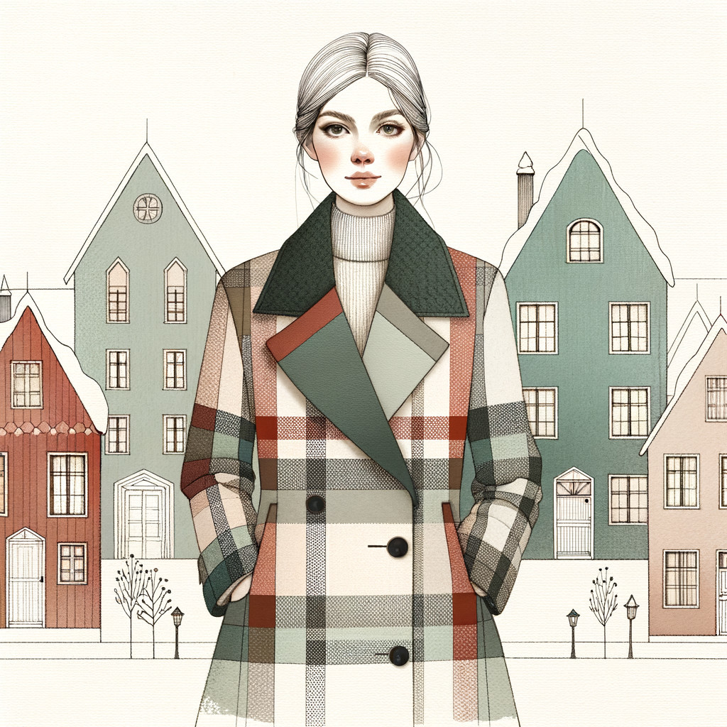 Prompt: A woman in a checked overcoat. Minimal Scandinavian Christmas village inspired by Lotta Olsson and Hanna Konola, geometric houses with snowy roofs, soft muted colors (sage, red, beige, blue-gray), clean white background, watercolor texture overlay.