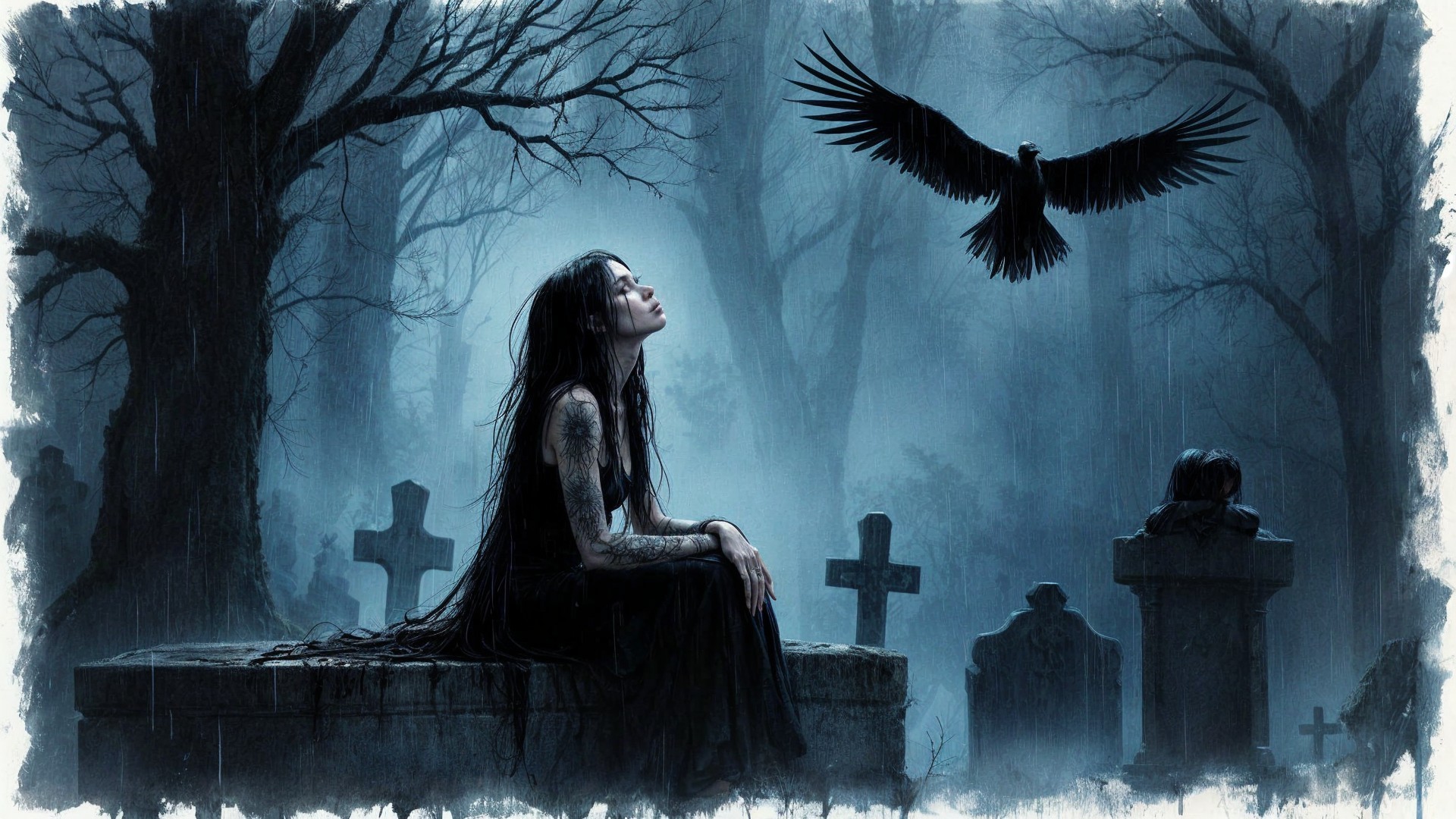 Prompt: 16:9 format of a delicate ink and watercolor wash rendering on rough handmade paper a dark, atmospheric scene set in a dense, rain-soaked cemetary at night. One gothic woman with long, black wet hair draped over her shoulders is sitting on a stone structure, gazing upward with a contemplative or hopeful expression. She is dressed in black clothing, with rain cascading down her face and body. She got black tattoes all over her body and a small facetattoo. The background features tall, jagged trees with sparse, dark foliage, and a large, ominous black bird flying nearby with wings spread wide. The scene is illuminated by a faint, cold blue light, emphasizing the rain and mist, creating a mysterious and moody ambiance.The Image is captured from a distance.