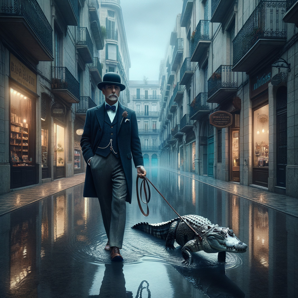 In his right hand, he holds a leather leash attached to a crocodile wearing a small black bow tie, following him like a polite pet.