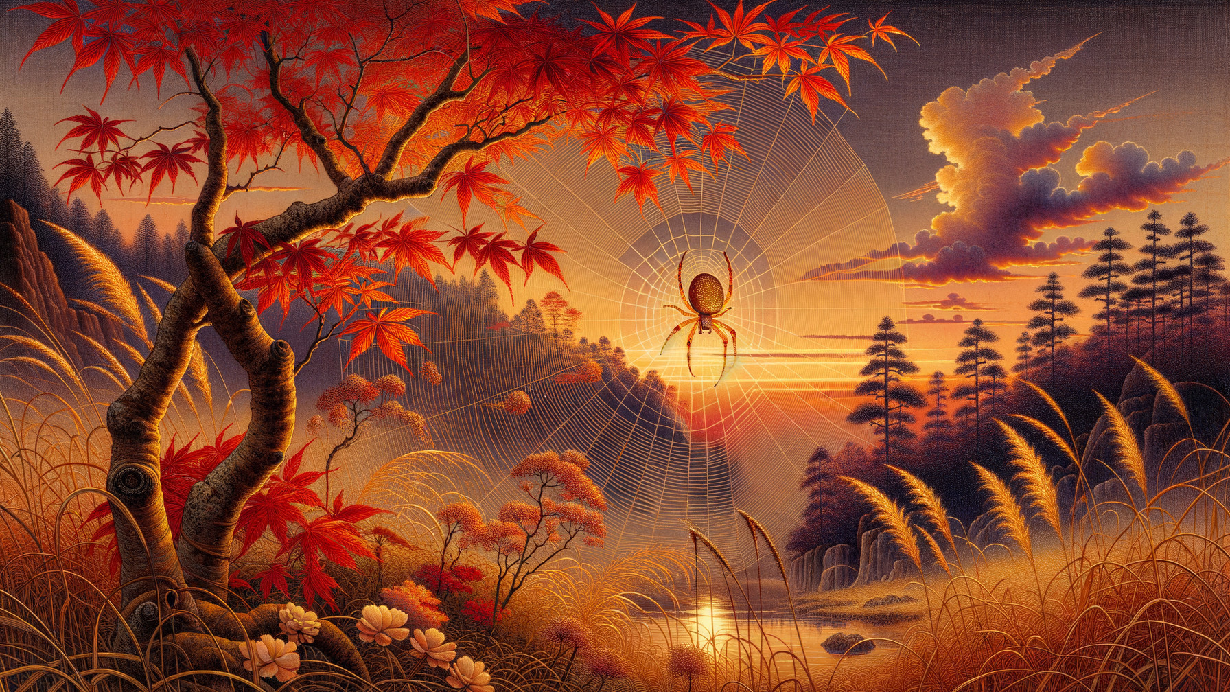 Prompt: A stunning closed-up view of a scene of a unique golden spider weaves its web between maple tree branches, surrounded by tall grass and wildflowers. Gradient red sunset sky. Puffy clouds in the far distance. Sun rays shine through the clouds reflecting on the surrounding water. Touches of line to give the illusion of wind direction. The artwork features intricate patterns, vibrant colors, and rich textures, creating a harmonious masterpiece, whimsical wind, japanese art, fine art, soft light orange background, brighten the image, flowery stiching art