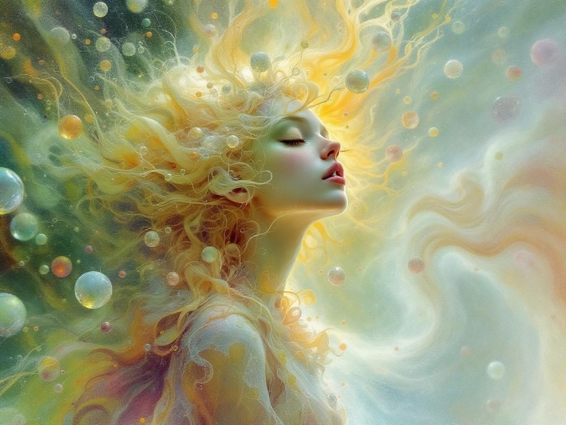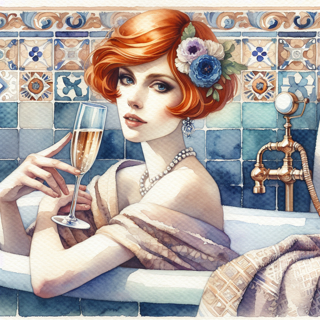 Prompt: Watercolor painting of an elegant woman with short red hair in a bathtub, holding a flute of champagne. Dominant colors are lapis lazuli, rose blue, beige, and ocher white. The style is sensual and classic, with floral details in her hair and patterns on the tiles and the towel. Wet-on-wet watercolor effect, highly detailed