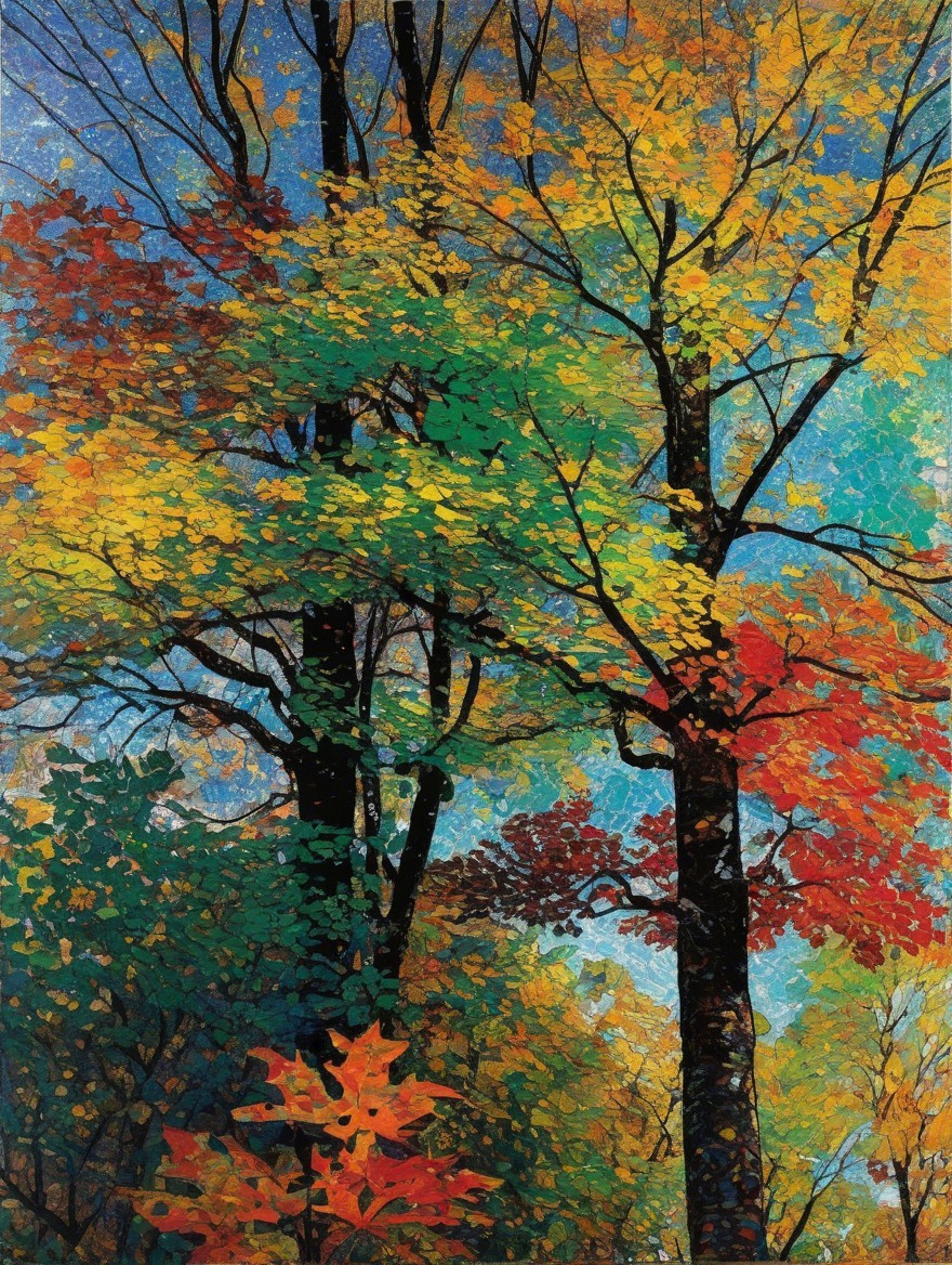 Prompt: Christian Schloe, Tom Everhart, Cy Twombly, David Downton, El Anatsui, Philip Taaffe, Jan Toorop, Koloman Moser: dappled light through fall leaves