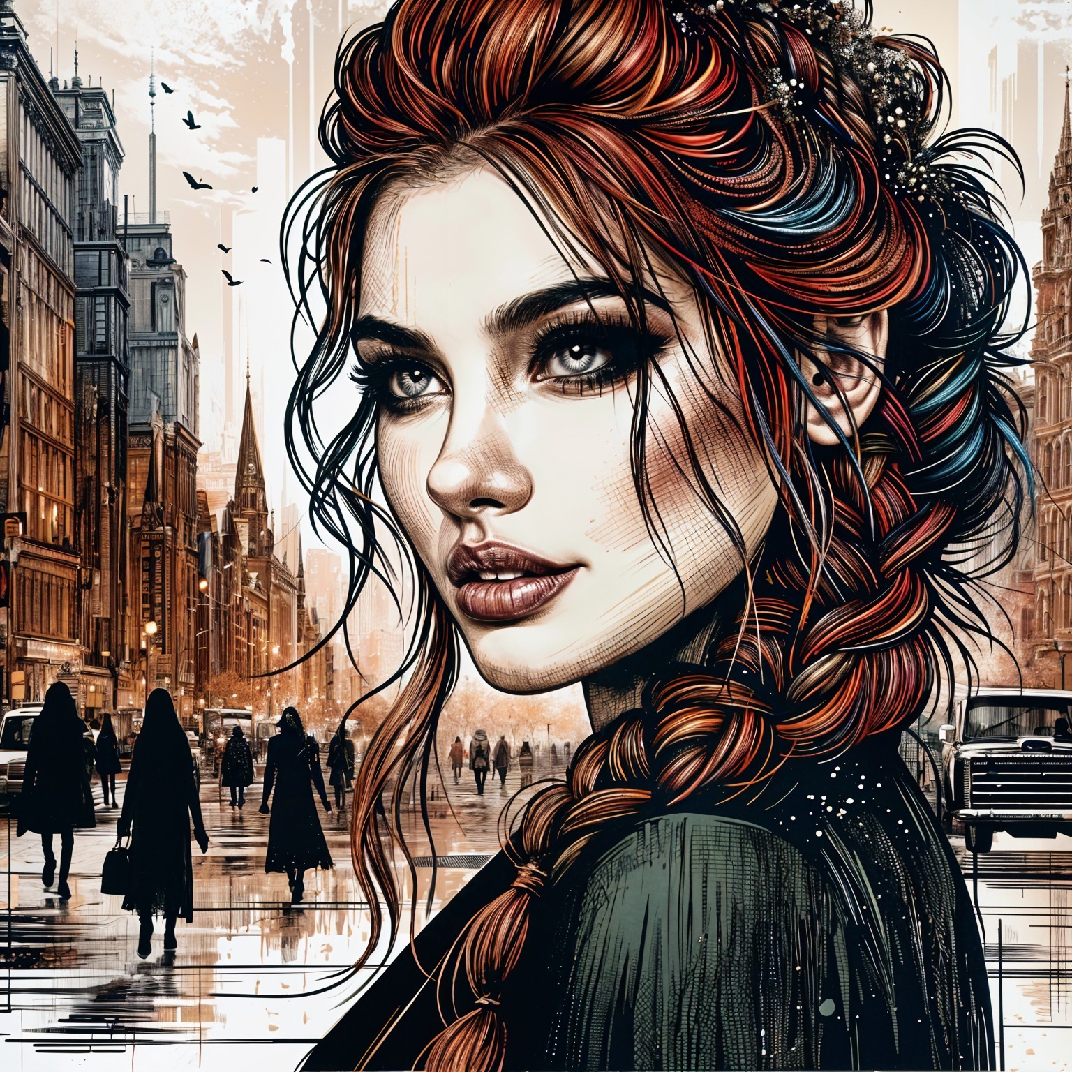 Prompt: Vibrant alcohol ink artwork, elegant woman with flowing long hair, adorned in a stylish fall dress and a chic hat, walking gracefully on a rustic dirt road, surrounded by blooming trees, colorful flowers, and vast fields, direct gaze towards the viewer, gentle wind causing her hair and dress to sway, rich autumnal color palette with deep reds, oranges, yellows, and browns, intricate details capturing the textures of nature, dreamy and whimsical style, soft and natural lighting enhancing the serene atmosphere. Without swirls, scrolls, spirals, circles, volutes, gnarls, vortices, vortex, in the background and in the sky.