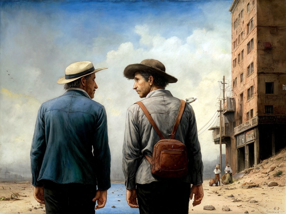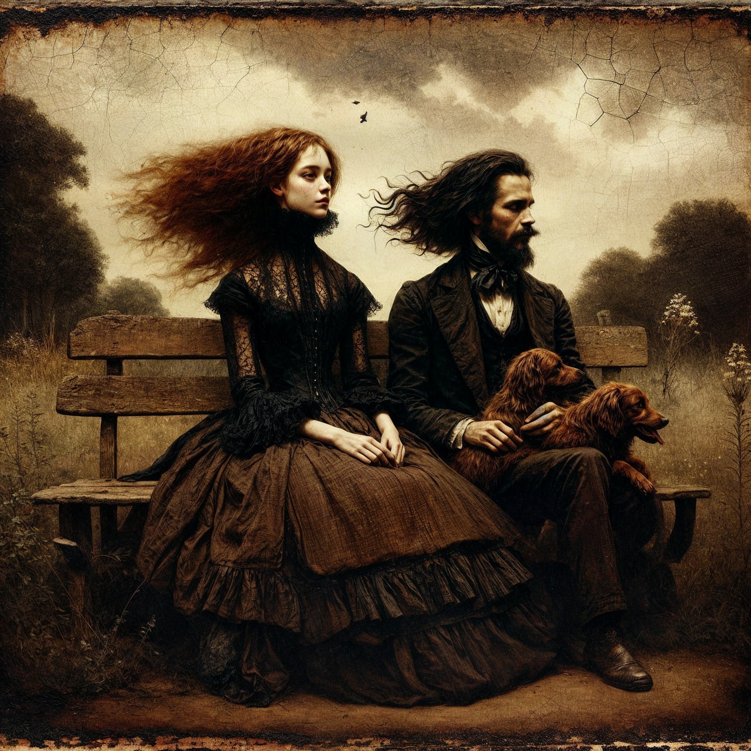Prompt: Create an old, hand-painted canvas in the style of folk art, inspired by a mysterious, blurry cinematic photograph, with peeling paint on an old park bench where a reddish-brown-haired woman sits with a man, both with long hair (his is dark brown and wavy), he has a goatee (visible only in profile), dressed in black. She has a gothic style and he holds a dog in his lap. Flowers are still blooming on a lazy, hazy summer day, their hair fluttering in the wind, their backs to each other. A bucolic scene with some dark clouds and dust raised by the wind creates an atmosphere of mysterious enchantment, with delicate details and undefined textures, small scratches, tears and cracks in the paint, in a style comparable to that of Gabriel Pacheco. The canvas has an extremely old texture. Colors such as brown, beige, desert orange, faded yellow, soft green and pale sky blue blend together like a sandy mist.