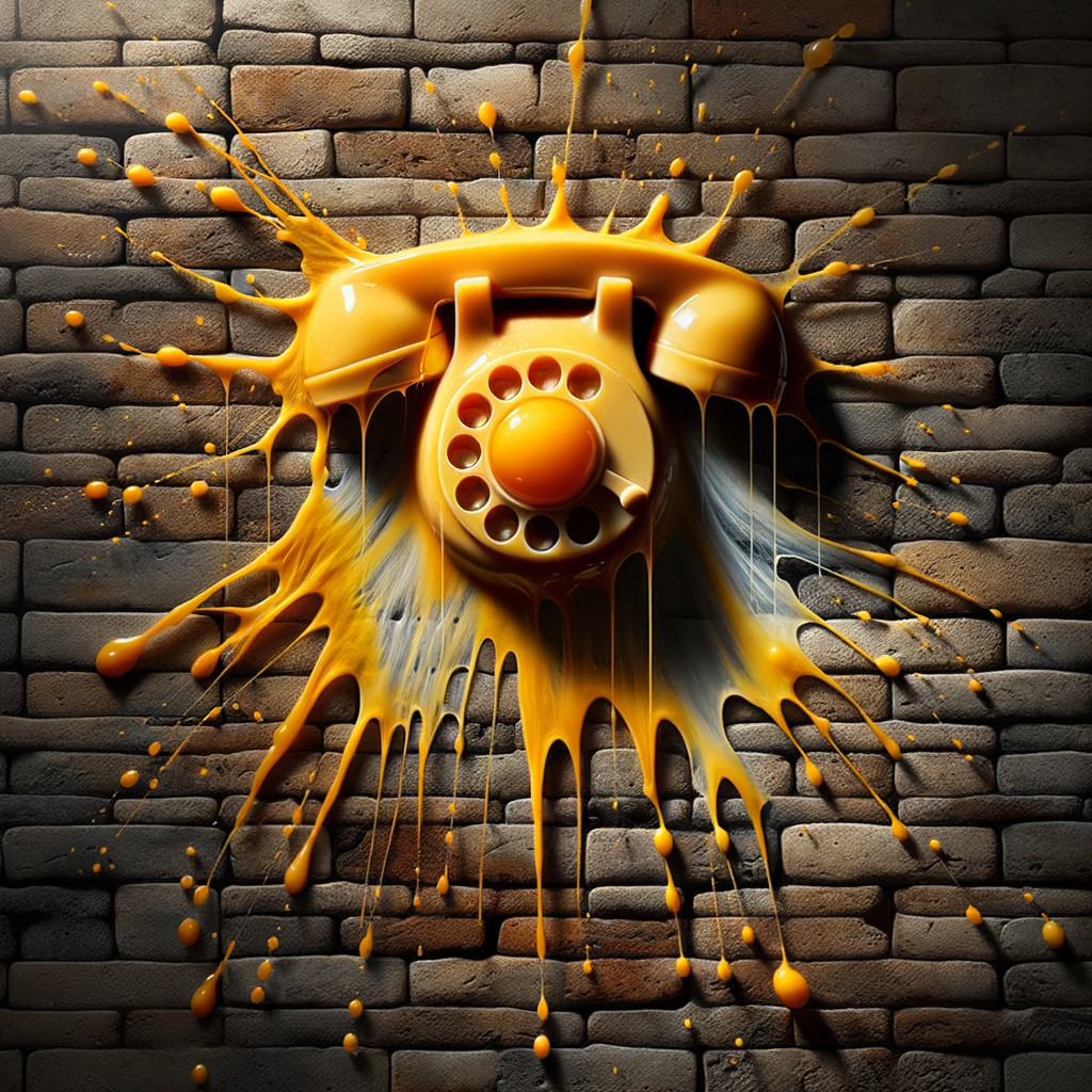 Prompt: A surreal and artistic scene where an egg has splattered dramatically against a textured brick wall. The golden yolk spreads in an unexpected yet mesmerizing pattern, forming the silhouette of a Rotary Telephone. Its features emerge fluidly from the rich, glossy yolk—soft yet defined. The egg white drapes around the shape like a delicate aura, enhancing the contrast against the rough, earthy tones of the bricks. The composition feels both spontaneous and intentional, as if the moment of impact created an accidental masterpiece.