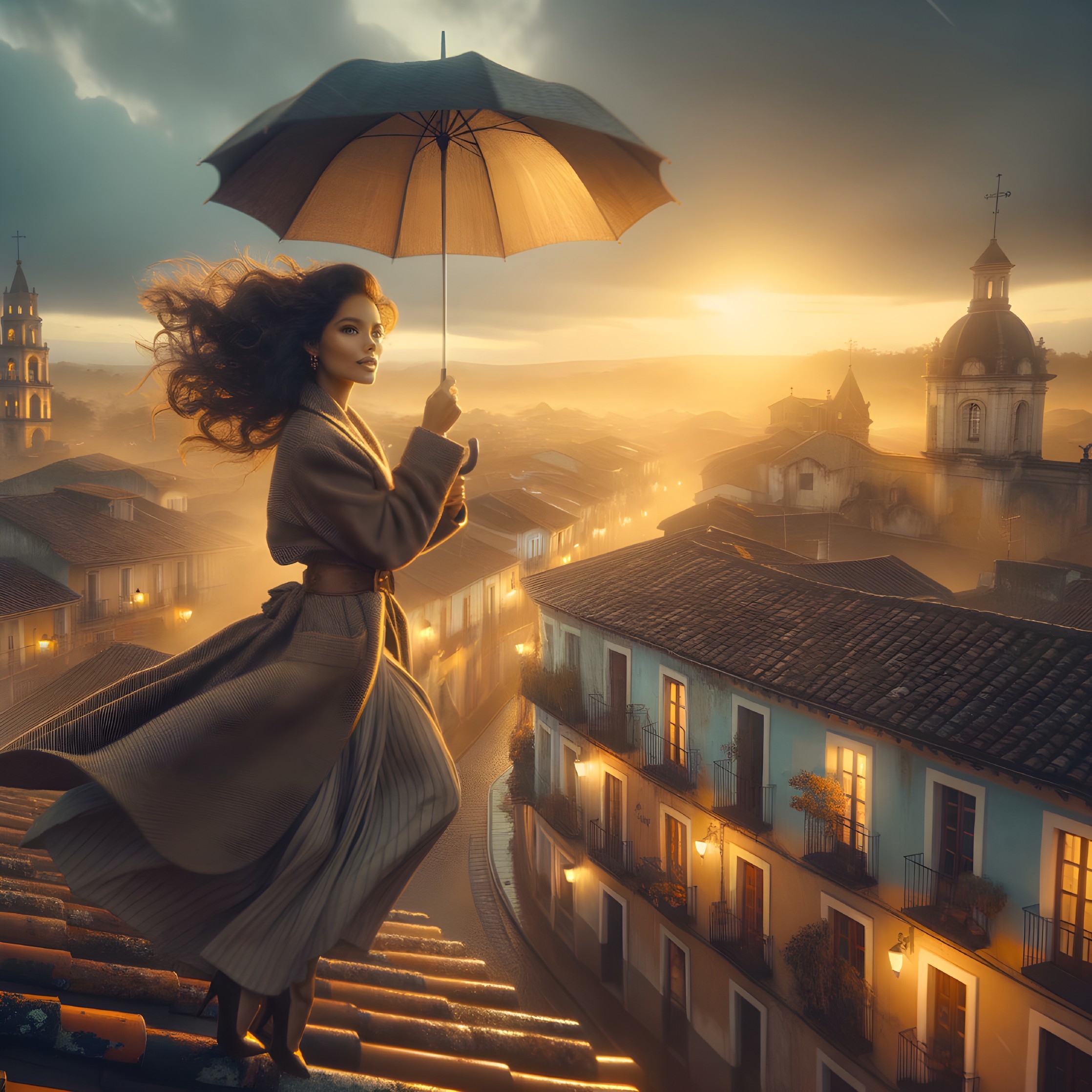 Prompt: A young woman in vintage clothing inspired by Mary Poppins flies gracefully above a sunlit old town at dawn. She holds an open umbrella as the morning breeze lifts her coat and hair, glowing in the golden light of sunrise. Below, rooftops shimmer with soft rain and warm window lights, while the sky shifts from blue to amber with drifting clouds. The mood is uplifting, whimsical, and filled with quiet wonder — the moment when the wind remembers her name. Painterly realism, cinematic lighting, in the style of Donato Giancola × Rovina Cai.
