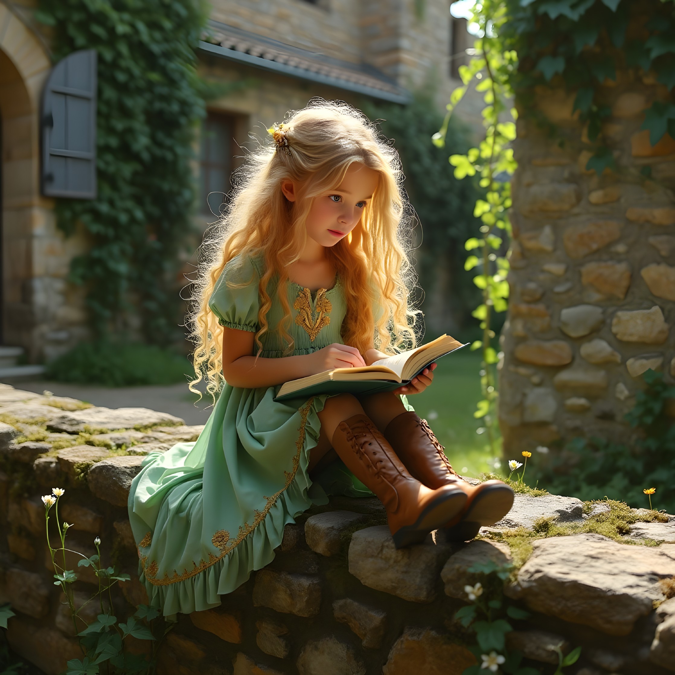Prompt: A young fairytale girl with long curly golden-blonde hair and bright blue eyes sits on a rustic stone wall, reading an open book. Her hair glows warmly in the sunlight, cascading over her shoulders. She wears a light emerald green dress with golden embroidery and soft leather boots. Ivy and small flowers grow between the old stones, creating a magical courtyard atmosphere. The scene is cinematic fairytale realism, whimsical and detailed. style by Maike Plenzke x Anna Dittmann