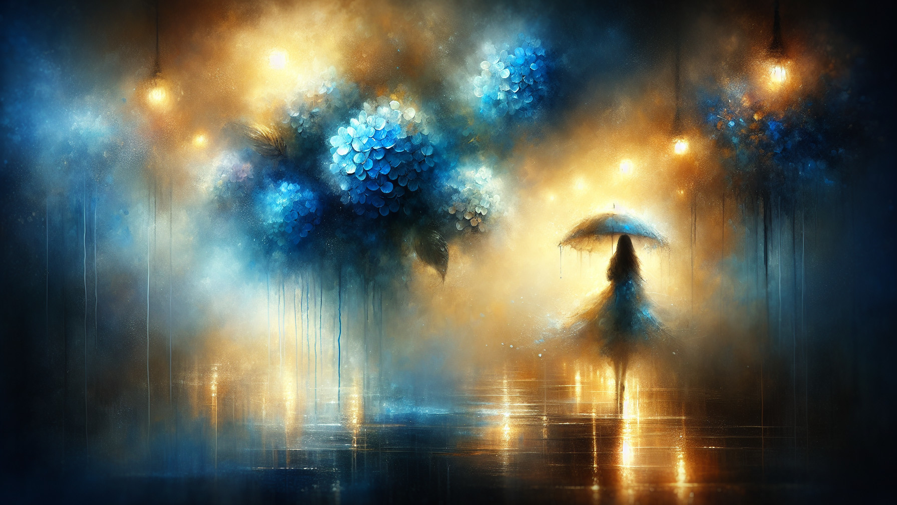 Prompt: Dreamy hazy breezy watercolor-oil hybrid painting in EmmAI Fragile Vision style, a melancholic yet luminous scene of a woman under an umbrella blooming with blue hydrangea petals, walking through gentle golden rain. surreal poetic atmosphere, motion-blurred reflections, fluid brush textures, soft bokeh, muted blue and amber palette, nostalgic lighting like a memory half-remembered. minimal paints, wet-on-wet diffusion, painterly imperfection, delicate melancholy, EmmAI dreamy hazy breezy Fragile Vision. No text, no frame, no symbols.