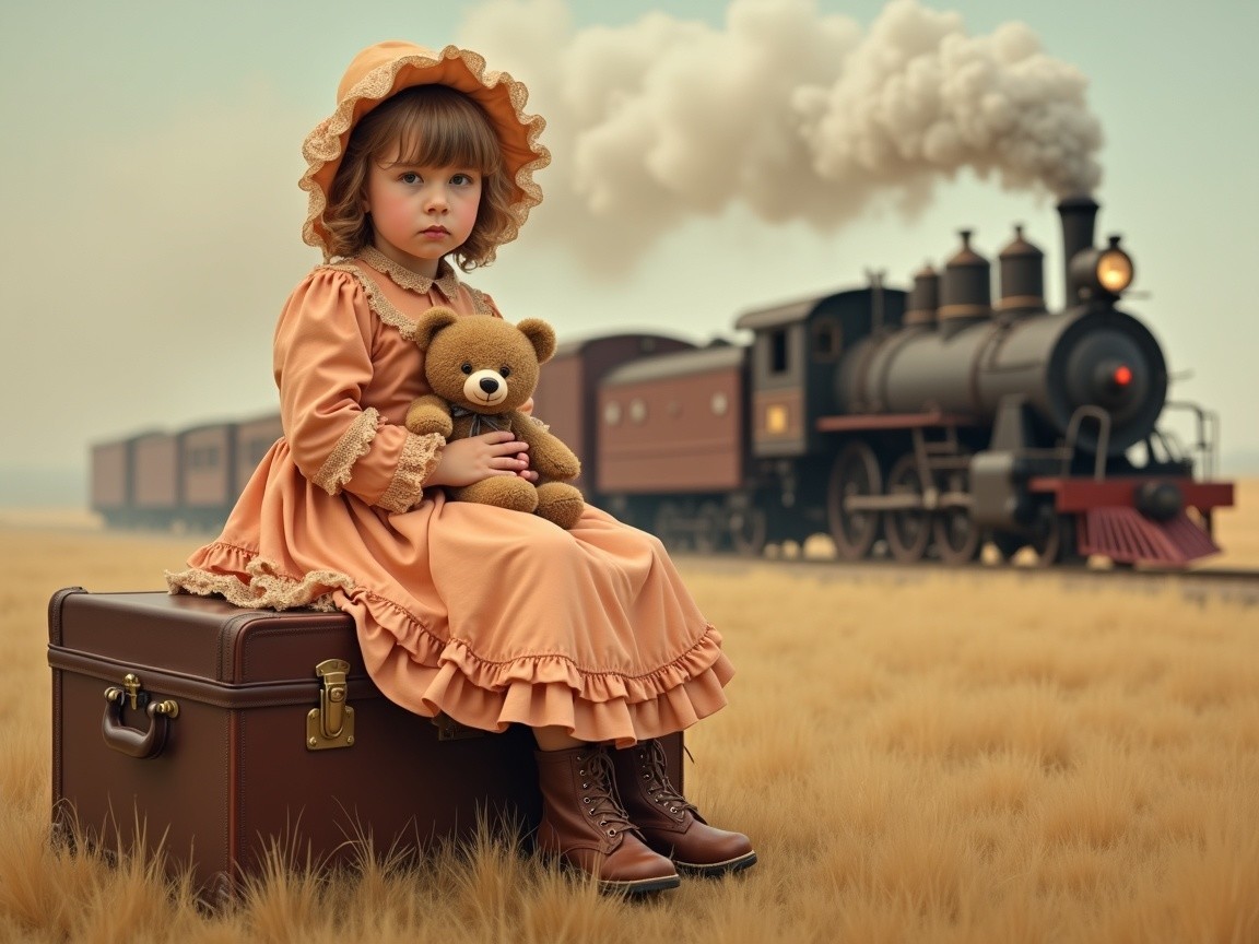 Prompt: Sitting on a large, old brown leather suitcase and teddy bear, wearing an ochre lace bonnet, a long, light salmon-colored dress with ruffles and puffed sleeves, and brown lace-up ankle boots. Her face has a sad expression. A steam train approaches in the distance in a blurry background. The historical period is 1870s American Western. Pastel colors.